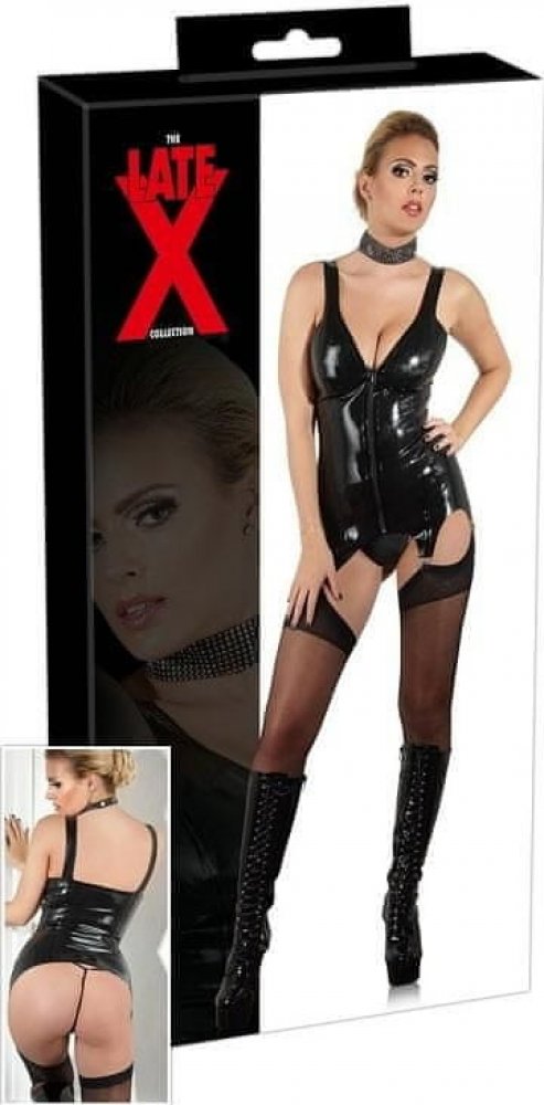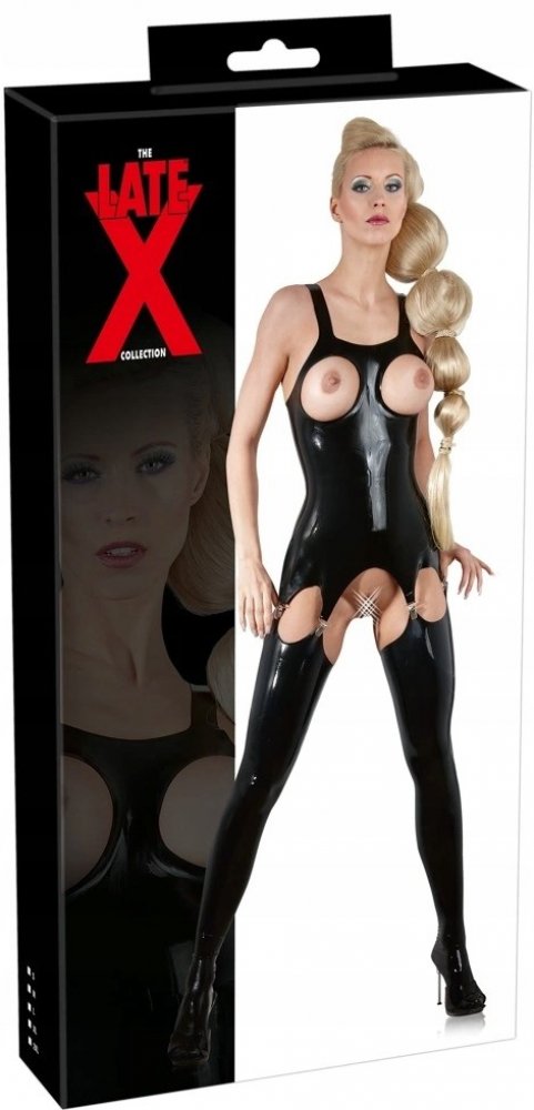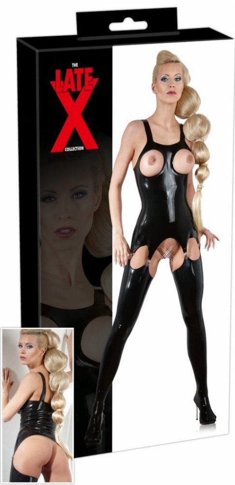 Latexový top má otvory na prsa a čtyři podvazkové pásky.
