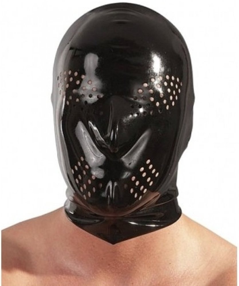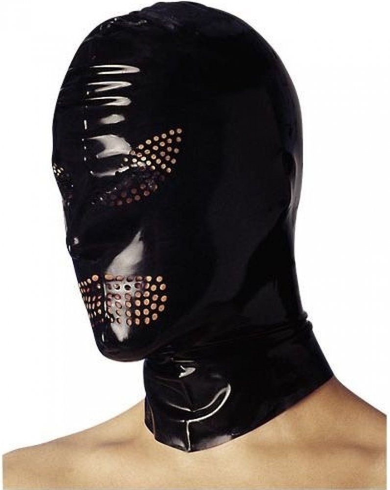 Erotické pomůcky: Černá latexová maska s děrováním.
