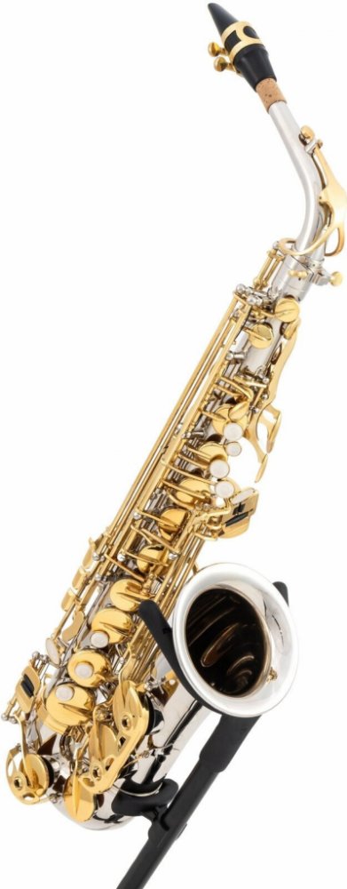 Tento saxofón s elegantným strieborným telom a zlatými tlačidlami je skutočným skvostom. Vyrobený z kvalitnej mosadze, zaručuje bohatý a plný zvuk v tónine Es. Vybavený je prvotriednymi podložkami z talianskej kože, ktoré zabezpečujú vynikajúce tesnenie a citlivú odozvu. Jeho povrch zdobia ručne vyrezávané vzory, svedčiace o precíznom remeselnom spracovaní.Profesionálna zvuková kvalita a výkon: Vychutnajte si bohaté, hladké tóny s pôsobivou zvukovou projekciou, ideálne pre náročných hudobníkov.Vynikajúce remeselné spracovanie: Ohromí vás nielen farebná kombinácia striebra a zlata, ale aj elegantné intarzie z imitácie perlete na klapkách.Komfort pri hraní: Protišmykové podložky pod dlaňové klapky a odolná ligatúra zaisťujú pohodlné a bezpečné držanie nástroja.Kompletná údržba: Súčasťou balenia je praktická čistiaca súprava pre udržanie vášho saxofónu v perfektnom stave.Bezpečná preprava: Nastaviteľné prenosné puzdro s mäkkou výstelkou spoľahlivo ochráni váš nástroj počas prenášania.