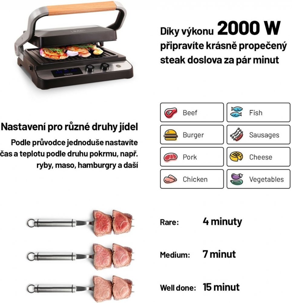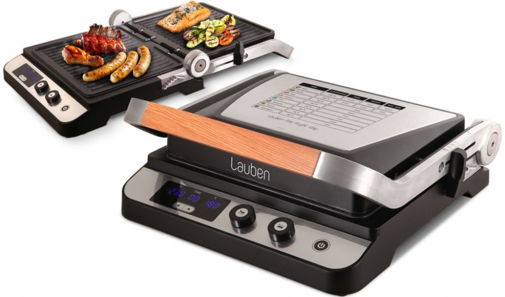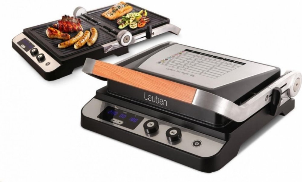 Ke slunným dnům letní sezóny neodmyslitelně patří venkovní grilování. S kontaktním grilem Lauben si ale můžete šťavnatý burger nebo čerstvou rybu vychutnat bez ohledu na počasí, kdykoli během roku. Tento flexibilní pomocník sjednocuje možnosti zapékacího kontaktního grilu a plnohodnotného stolního grilu. Je jen na vás, zda se rozhodnete připravit si rychlé domácí panini, nebo gril nastavíte do BBQ módu a uspořádáte večírek s grilováním pro přátele. Díky výkonu 2000 W si gril bez problému poradí i s prudkým opečením, které je potřeba u kvalitních steaků, disponuje dostatečnou grilovací plochou 1500 cm2, regulátorem teploty a časovačem. Plotýnky grilu jsou odnímatelné, každé z nich lze separátně nastavit teplota ohřevu a vy tak můžete připravovat různé druhy potravin zároveň. Teplota ohřevu lze nastavit v rozmezí od 60 do 230 °C, vhodnými teplotami pro jednotlivé druhy potravin vás provede přiložený průvodce. Součástí grilu je praktická miska na odkapávání přebytečného tuku a šťávy. Příjemným bonusem je kvalitní designové provedení vhodné do exteriéru i interiéru.