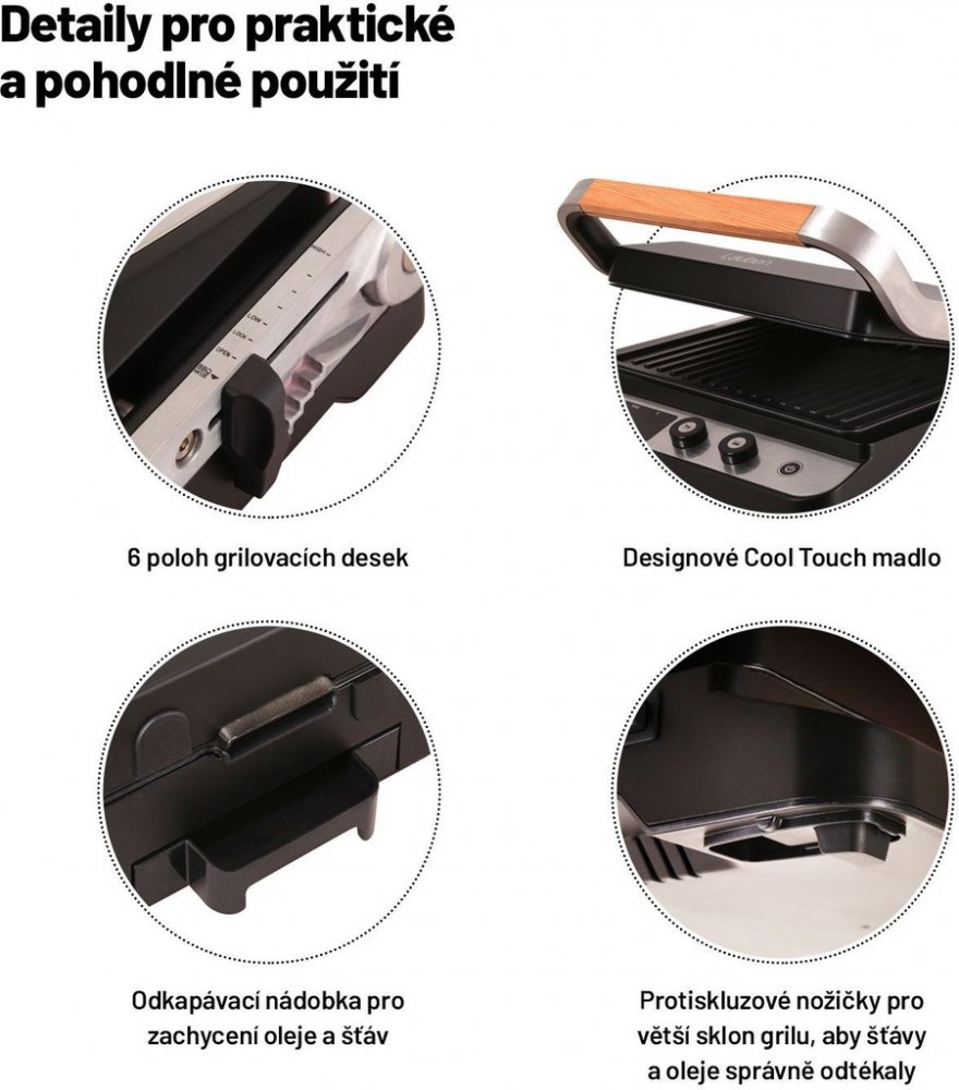 Odkapávací nádoba, regulace teploty, vyjímatelné plotýnky, nepřilnavý povrch, protiskluzové nožičky, signalizace provozu, displej, zámek rukojeti, designové madlo