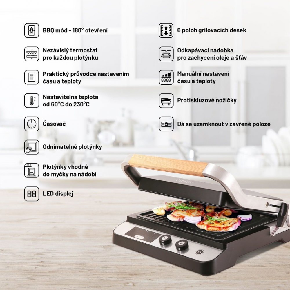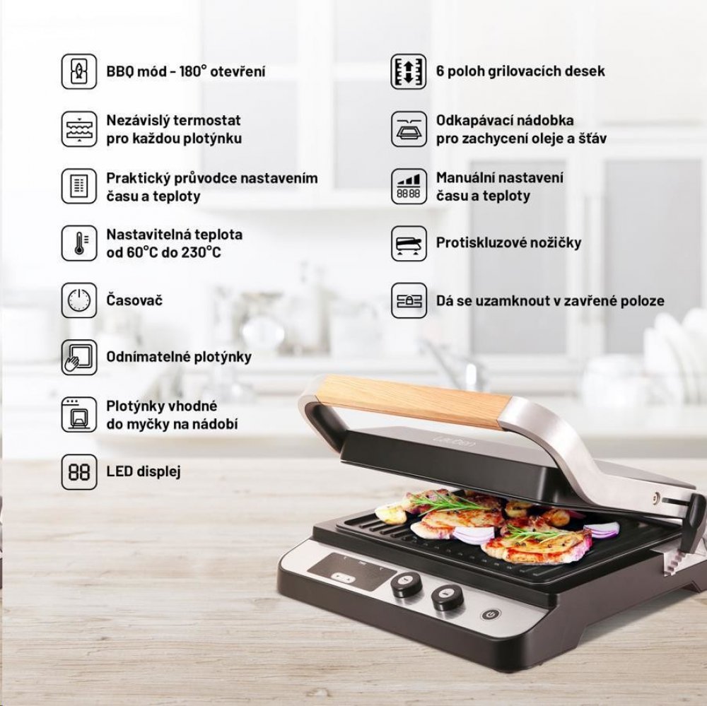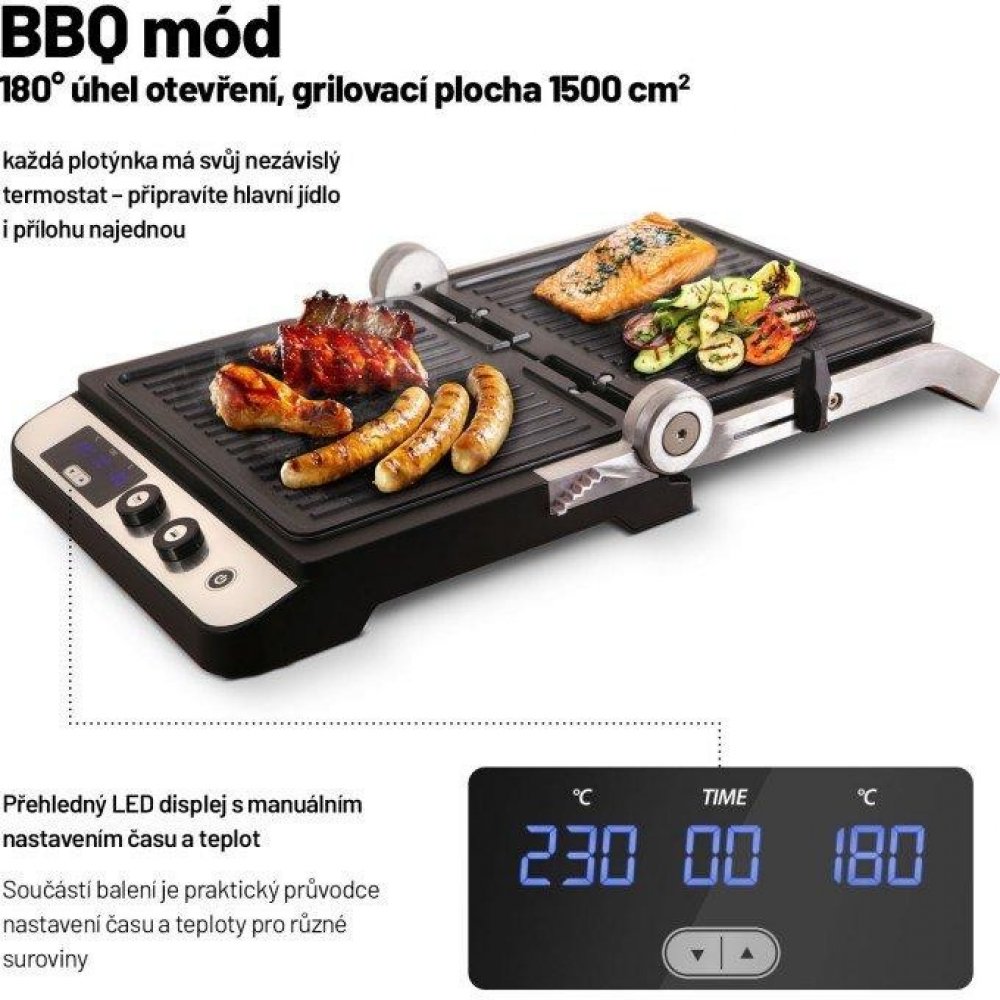Plotýnky grilu mají nastavitelnou polohu. Můžete například upravit výšku a sklon plotýnky tak, aby se snížil tlak působící na křehké suroviny, jako jsou třeba čerstvé ryby. V BBQ módu si u každé z plotýnek můžete nastavit požadovanou teplotu ohřevu separátně. Se správnou volbou teploty pro jednotlivé druhy potravin vám pomůže přiložený průvodce. Zároveň si pro každý pokrm můžete nastavit požadovaný čas přípravy, takže se nemusíte bát, že netrefíte správný stupeň propečení. Gril je vybaven i funkcí automatického vypnutí, díky vysokému výkonu se velmi rychle rozehřeje a o průběhu přípravy máte přehled díky LED displeji. V nabídce jsou i ploché plotýnky pro ještě širší možnosti grilu.