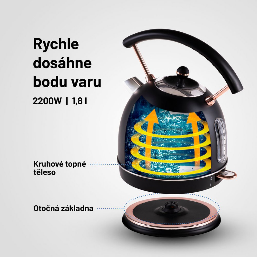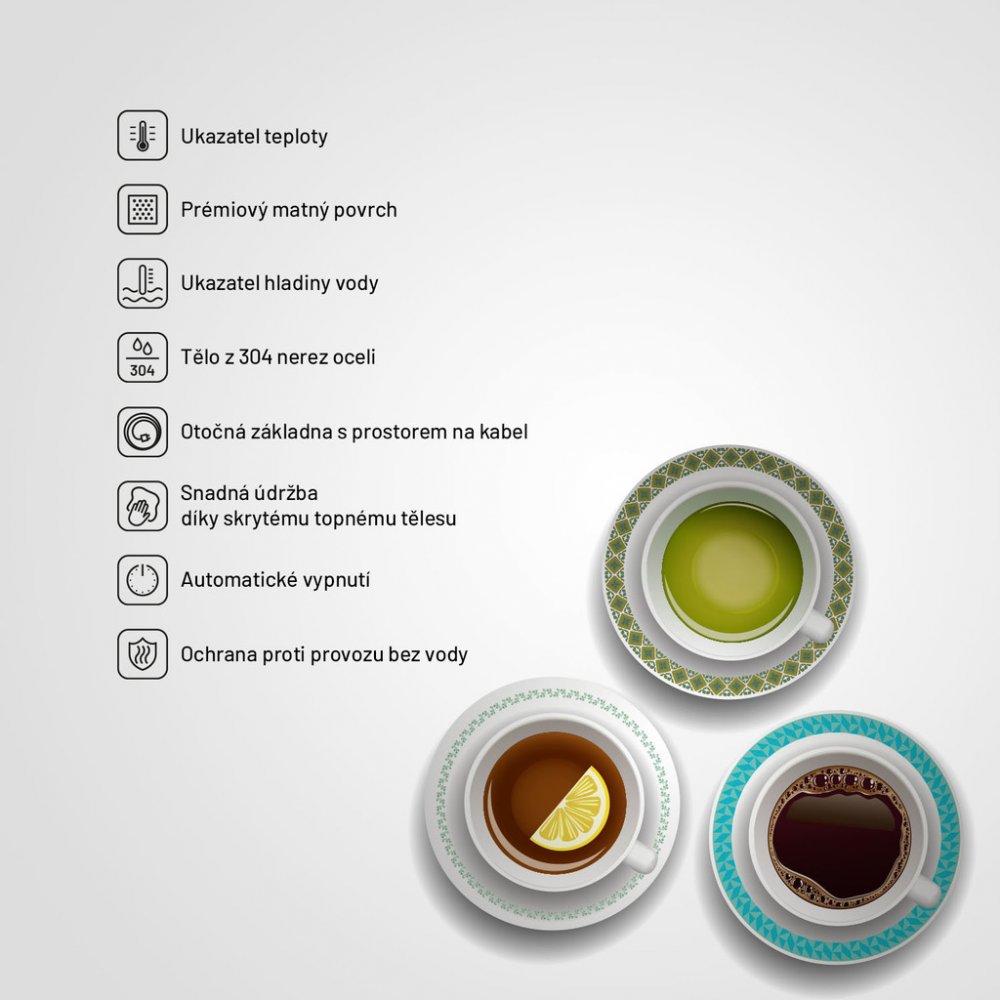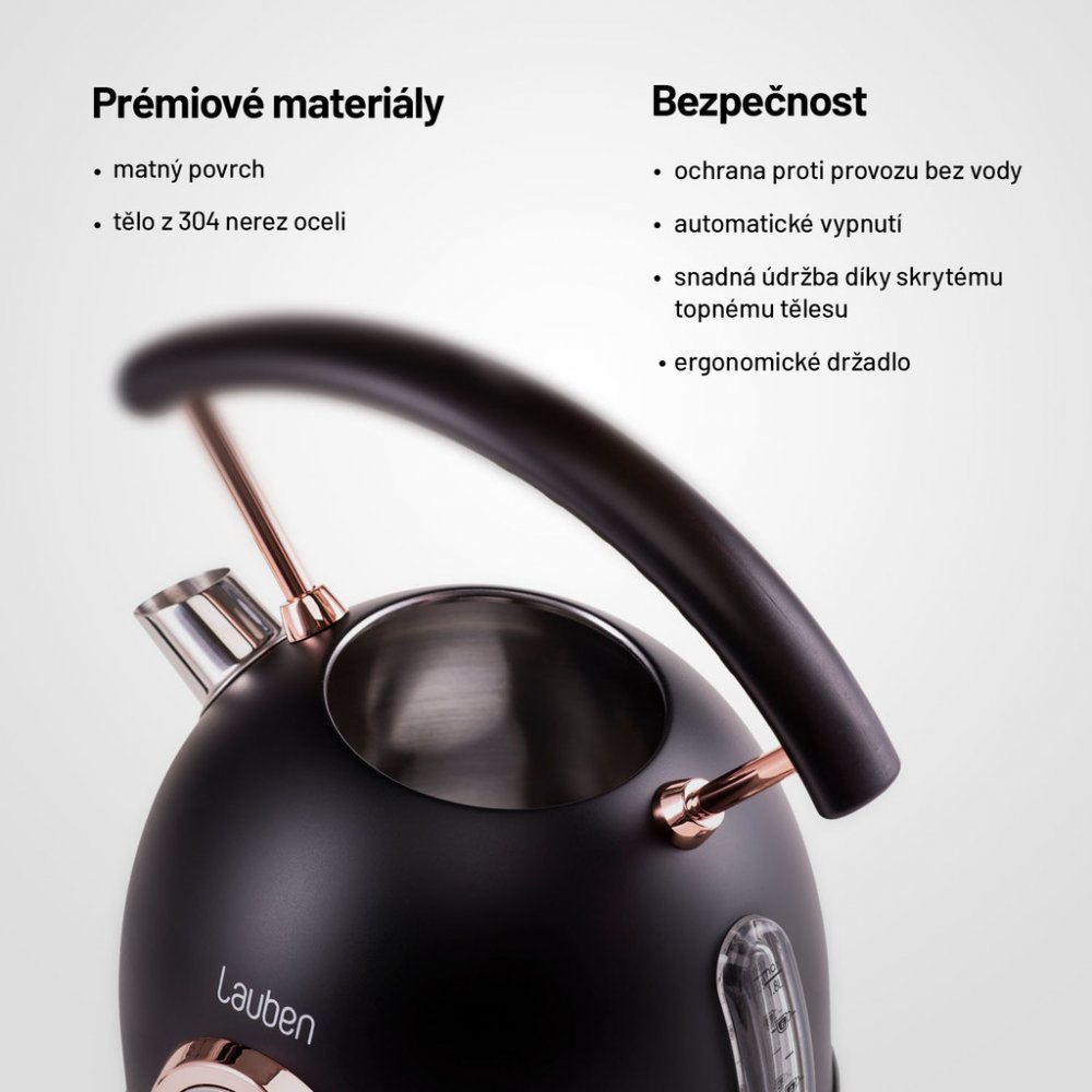 Rychlovarná konvice je jistě nepostradatelnou součástí každé kuchyně. Může být ale zároveň stylovým doplňkem, který pozvedne váš interiér na vyšší úroveň. Lauben Electric Kettle 17BC je designová rychlovarná konvice ve stylu Artdeco s prémiovým matným povrchem z #304 nerezové oceli. Údržba konvice je snadná, topné těleso je skryto, tudíž se méně zanáší a konvice se lépe čistí. Mysleli jsme i na bezpečnost, konvice má pojistku proti přehřátí i vaření bez vody. Aktuální teplotu vody můžete sledovat na teploměru na konvici. Potřebujete-li zalít zelený čaj, nemusíte čekat, až voda vychladne, ale stačí prostě včas vypnout. Díky svému designu konvice nejen dobře vypadá, ale je i praktická. Základna je otočná o 360° pro jednoduchou manipulaci a samozřejmostí je prostor pro skrytí kabelu, který jinak překáží a nevypadá hezky.