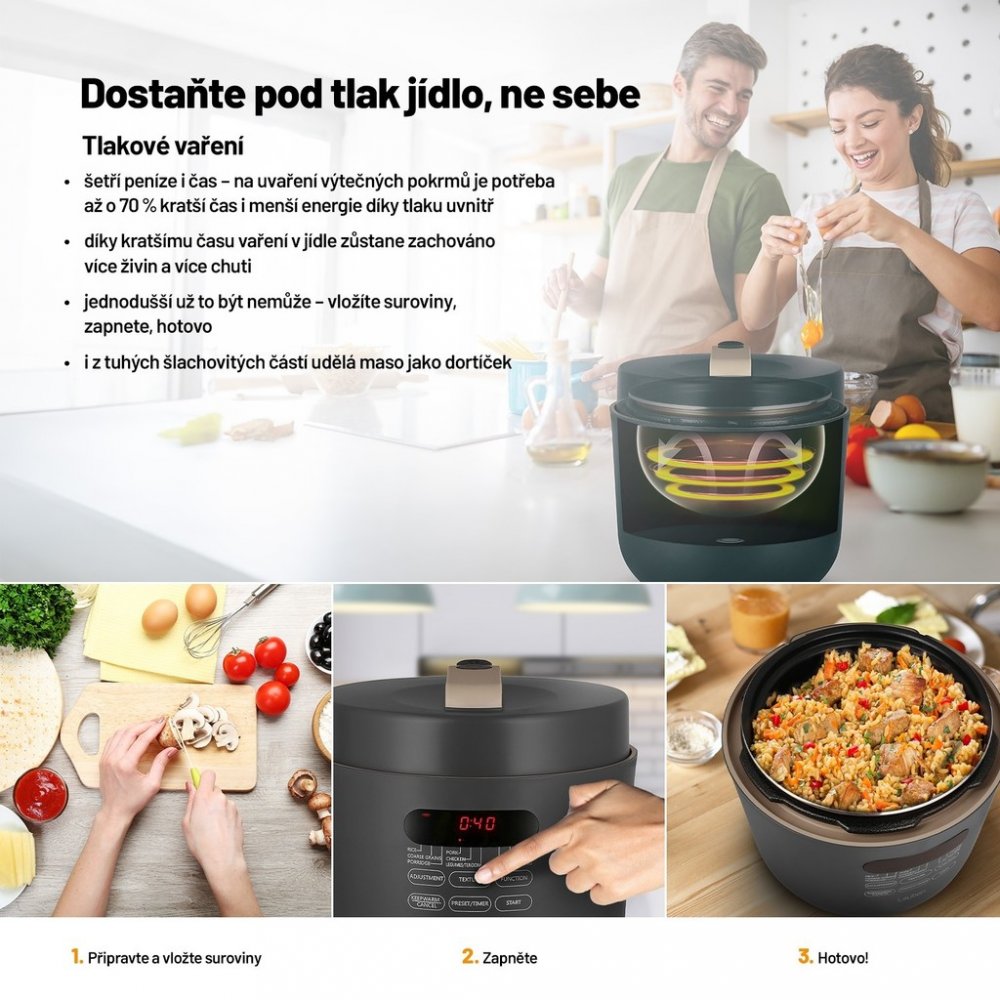 Přístroj disponuje 9 přednastavenými programy - rýže, hrubé obiloviny, porridge, vepřové, kuře, luštěniny/šlachovitá masa, rychlá omáčka, polévka, ohřev. Pouze veškeré suroviny vložíte do tlakového hrnce, uzavřete a navolíte příslušný program. Obdobně máte možnost vybrat si ze 3 úrovní struktury masa, tuhá až měkká. Čas vaření lze upravit i manuálně. Díky funkci Keep Warm udržíte jídlo teplé i pro opozdilce. Funkce odloženého startu zase pomůže, abyste po příchodu domů měli již jídlo hotové.