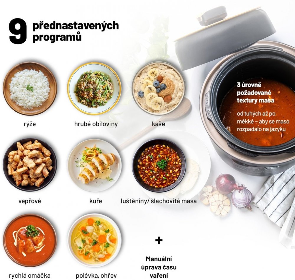 Přístroj disponuje 9 přednastavenými programy - rýže, hrubé obiloviny, porridge, vepřové, kuře, luštěniny/ šlachovitá masa, rychlá omáčka, polévka, ohřev.