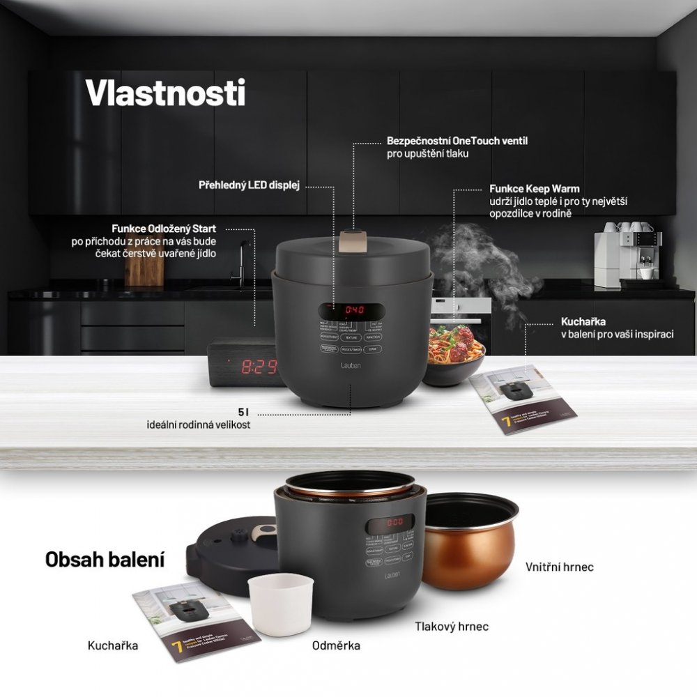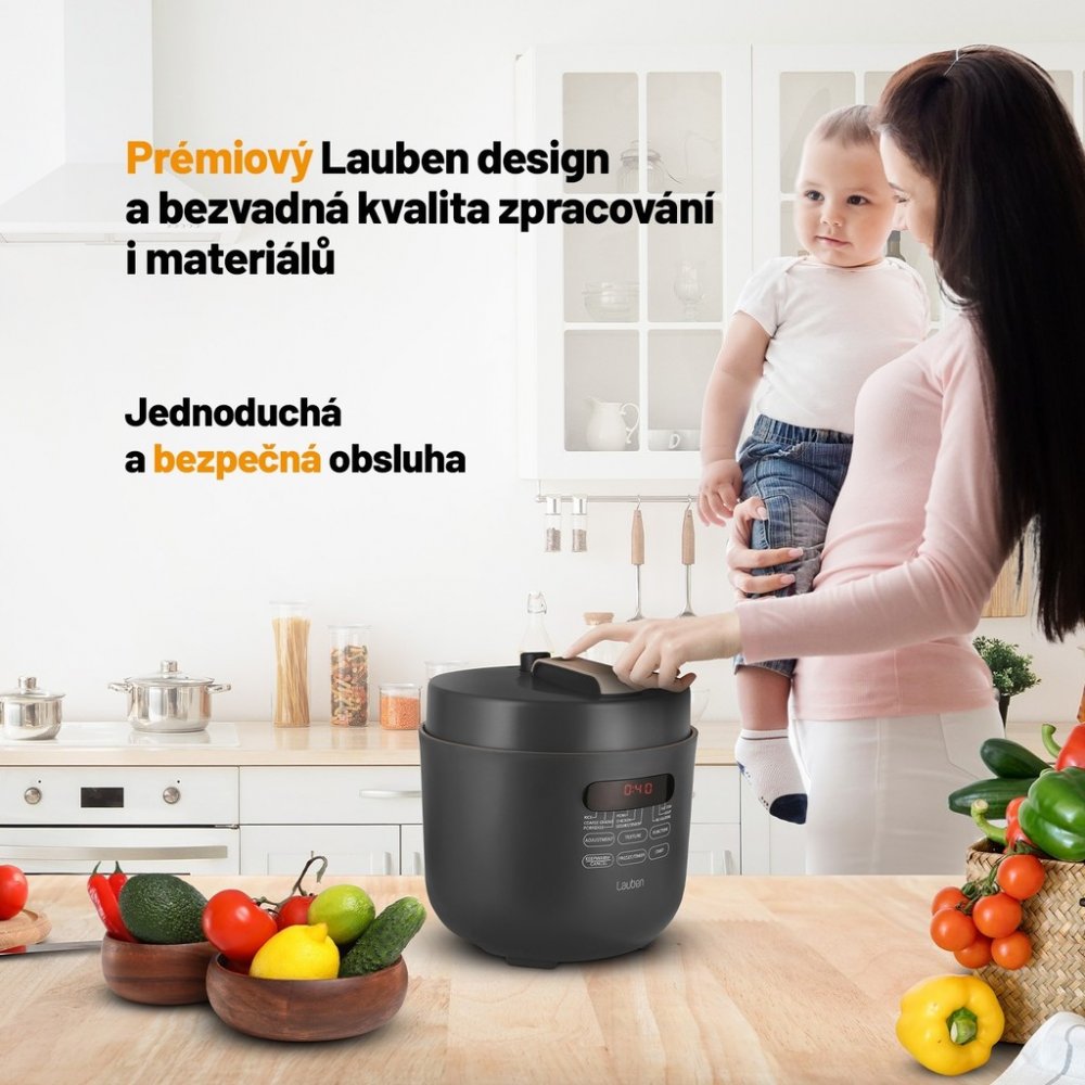 Tlakové hrnce bývaly vždy vítanými, avšak obávanými společníky v domácnosti. Energeticky úsporný víceúčelový elektrický tlakový hrnec Lauben Electric Pressure Cooker 5000AT má všechny výhody tzv. papiňáku a ještě víc, jen v moderním a bezpečném hávu. Čas i peníze šetří kratší dobou přípravy díky tlaku uvnitř, navíc takto se zachová v jídle více živin. I když nejste kuchařský mistr, oblíbíte si fakt, že do hrnce stačí dát suroviny, zapnout a on se už postará. Hrnec disponuje 9 přednastavenými programy a 3 úrovněmi požadované struktury masa. Čas přípravy ovlivníte i manuálně. 5l objem stačí pro celou rodinu, údržba je snadná, bezpečnost zajišťuje One Touch ventil pro upuštění tlaku. Jídlo udrží teplé funkce Keep Warm, lepší plánování umožní odložený start. Balení obsahuje též kuchařku.