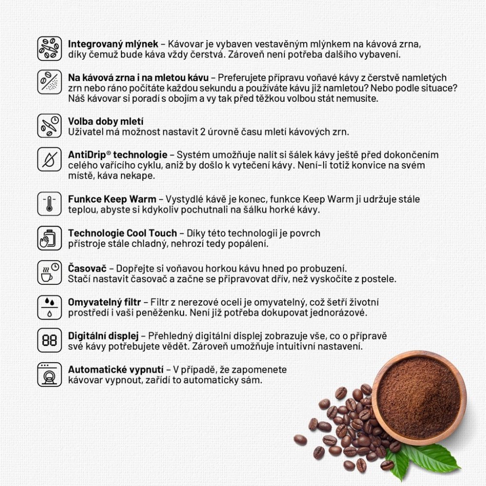 Vystydlé kávě je konec, funkce Keep Warm ji udržuje stále teplou, abyste si kdykoliv pochutnali na šálku horké kávy.