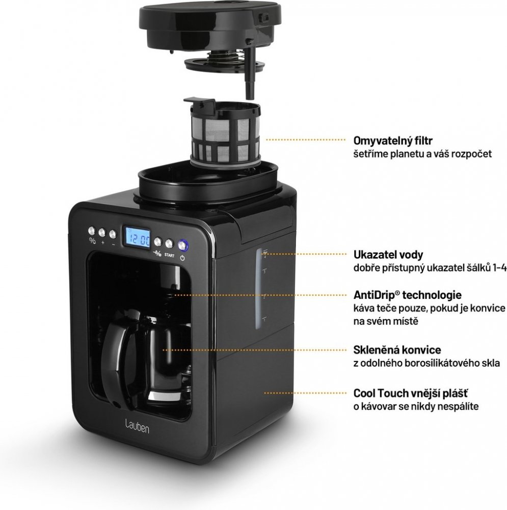 Dopřejte si každý den klidnou chvilku se šálkem lahodné překapávané kávy. Kávovar Lauben Grind&Drip Coffee Maker 600BB ji připraví během chvilky z čerstvě namletých zrn díky zabudovanému mlýnku. Nepotřebujete tak další příslušenství, odpadá i přesýpání kávy z mlýnku. Ač umí připravit také kávu z již namletých zrn, čerstvě umletá chutná nejlépe. Funkce Keep Warm navíc zajistí, že si nápoj užijete vždy horký. Vše potřebné nastavíte na přehledném digitálním displeji a pak už jen čekáte, než do skleněné konvice nakape černý mok. Čekání vás ušetří funkce časovače, která zajistí, že bude káva připravena na požadovanou dobu. Díky technologii Lauben AntiDrip® navíc umožňuje nalití kávy ještě před dokončením cyklu. Bezpečnost kávovaru prémiového kompaktního designu zajišťuje funkce automatického vypnutí a technologie Cool Touch. Čas uspoří snadná údržba, k níž přispívá také omyvatelný filtr z nerezové oceli. Není třeba stále dokupovat papírové jednorázové, takže šetří vaši peněženku a rovněž životní prostředí.
