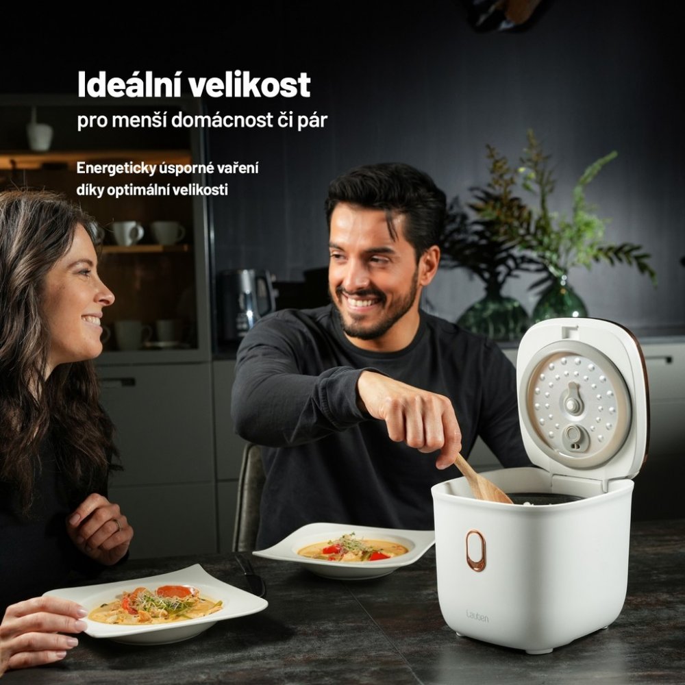 Efektivita, snadné použití a design mají společného jmenovatele, je jím víceúčelový rýžovar Lauben Multifunction Rice Cooker 1200WR Rose Gold Edition. Stiskem jediného tlačítka uvaří všechny druhy rýže na správnou tvrdost a 6 přednastavených funkcí vykouzlí další pokrmy jako kaše nebo polévky. Čas některých programů si však na intuitivním dotykovém displeji můžete nastavit i manuálně. Díky funkci odloženého startu lze mít jídlo připraveno už po návratu domů, opozdilci zase ocení funkci Keep Warm, která udrží pokrm teplý bez rozvaření. Porce nasytí jednotlivce i páry, jež pak mají více času pro sebe, protože ani údržba nezabere čas. Vnitřní hrnec lze dát do myčky. Bezpečné používání zajišťuje ochrana proti přetečení a technologie Cool Touch proti popálení. Rýžovar bude ozdobou každé kuchyně, kterou rozzáří trendy rose gold barvou, a přitom nezabere takřka žádné místo.