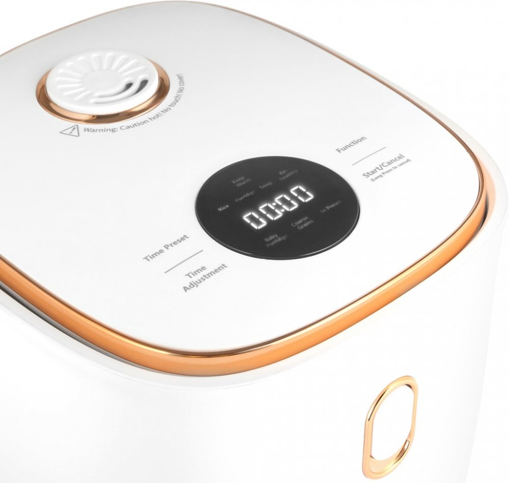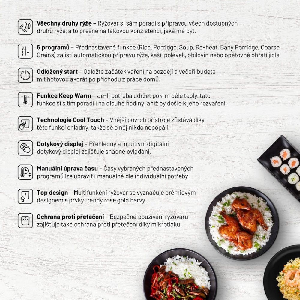 Multifunkční rýžovar se vyznačuje prémiovým designem s prvky trendy rose gold barvy.
