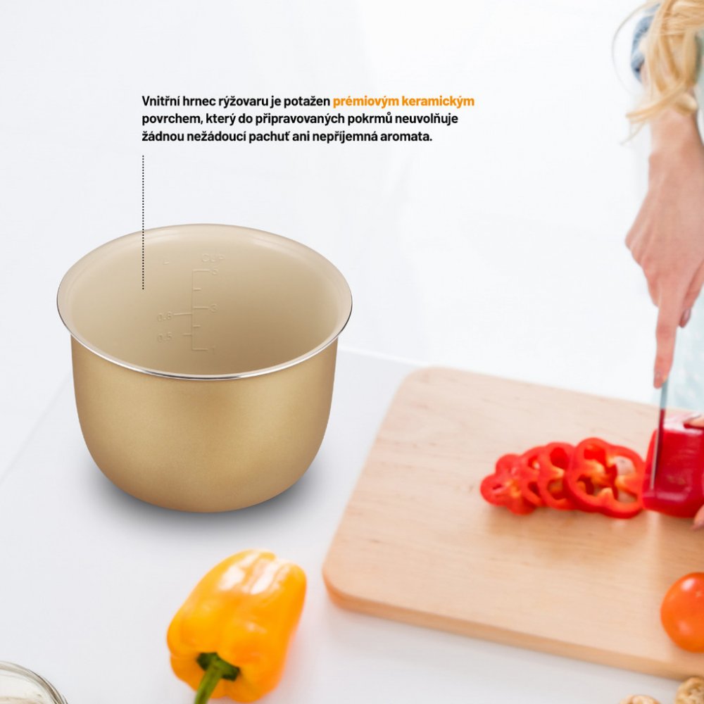 Vnitřní hrnec rýžovaru je potažen prémiovým keramickým povrchem, který do připravovaných pokrmů neuvolňuje žádnou nežádoucí pachuť ani nepříjemná aromata. Povrch je navíc nepřilnavý, takže se nic nepřipálí.