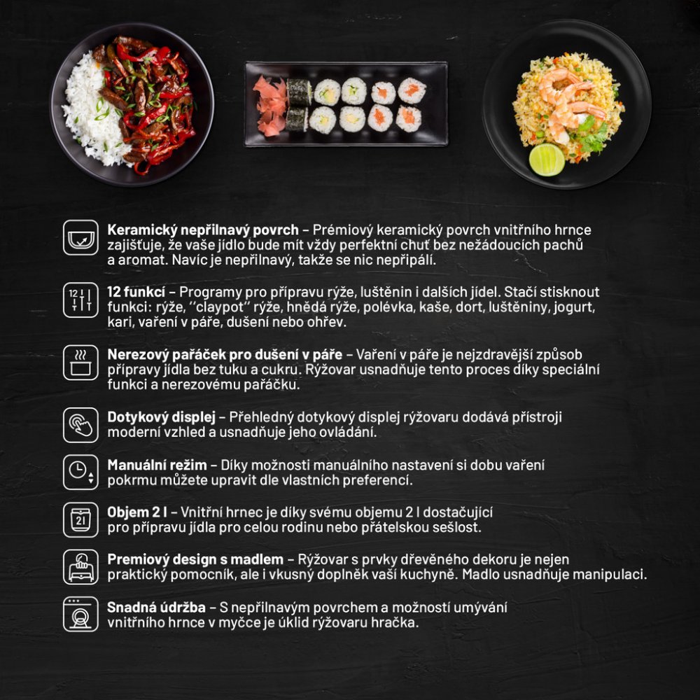 Rýžovar disponuje 12 přednastavenými programy pro přípravu rýže, luštěnin i dalších jídel. Stačí stisknout funkci: rýže, "claypot" rýže, hnědá rýže, polévka, kaše, dort, luštěniny, jogurt, kari, vaření v páře, dušení nebo ohřev. Vaření tak zvládne i začátečník.