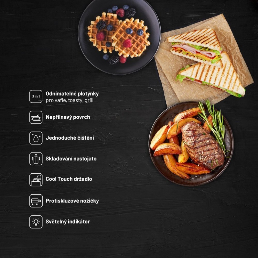 Parametry Příkon 900 W Vyměnitelné plotýnky ano LED kontrolka ano V balení plotýnky na vafle, toasty, gril Plotýnky vhodné do myčky ne Vertikální skladování ano Kabel 80 cm Rozměry 23,5 × 24 × 10 cm Rozměry plotýnky 22,5 × 12,5