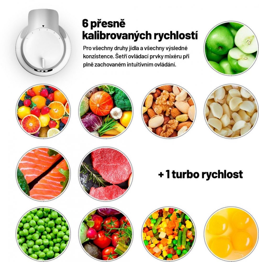 Bohaté příslušenství – Součástí balení je několik mixovacích nádob a nástavců, včetně sekací nádoby, šlehací metly nebo speciálního nástavce na přípravu bramborové kaše.
