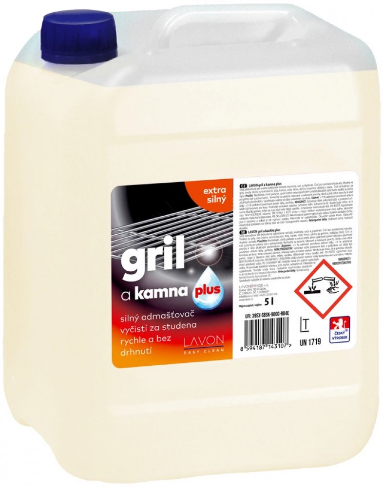 Extra silný čisticí odmašťovač pro snadné odstranění nečistot, mastnoty, sazí a připálenin. Čistí bez mechanické námahy. Vhodný na grily, trouby (mimo samočisticích), krby, kamna, rošty, hrnce, plechy na pečení, obklady a spáry. Čistí za studena i za tepla. Používejte ochranné pomůcky dle informací na etiketě. Vlastnosti odmašťovače: extra silný odmašťovač čistí i za studena vyčistí rychle a bez drhnutí Možnosti použití: grily, rošty trouby (mimo samočisticích) krby, kamna hrnce, plechy na pečení obklady a spáry Použití: Nastříkejte na znečištěný povrch, chvíli počkejte a poté setřete nebo opláchněte (zvlášť důkladně opláchněte nádobí a plochy pro přímý styk s potravinami). Nevhodný na mořené, lakované a voskované povrchy, hliník a jiné citlivé povrchy k silně alkalickým prostředkům. Bezpečnostní upozornění GHS05 - korozivní a žíravé látky Signální slovo: Nebezpečí Obsah nebezpečných látek Hydroxid sodný, hydroxid draselný H290 Může být korozivní pro kovy. H314 Způsobuje těžké poleptání kůže a poškození očí. P101 Je-li nutná lékařská pomoc, mějte po ruce obal nebo štítek výrobku. P102 Uchovávejte mimo dosah dětí. P260 Nevdechujte prach/dým/plyn/mlhu/páry/aerosoly. P280 Používejte ochranné rukavice/ochranný oděv/ochranné brýle/obličejový štít. P301+P330+P331 PŘI POŽITÍ: Vypláchněte ústa. NEVYVOLÁVEJTE zvracení. P303+P361+P353 PŘI STYKU S KŮŽÍ (nebo s vlasy): Veškeré kontaminované části oděvu okamžitě svlékněte. Opláchněte kůži vodou/osprchujte. P305+P351+P338 PŘI ZASAŽENÍ OČÍ: Několik minut opatrně vyplachujte vodou. Vyjměte kontaktníčočky, jsou-li nasazeny a pokud je lze vyjmout snadno. Pokračujte vevyplachování. P310 Okamžitě volejte TOXIKOLOGICKÉ INFORMAČNÍ STŘEDISKO/lékaře/ tel. 224919 293 nebo 224 915 402 (24 hodin denně) P501 Odstraňte obsah/obal dle instrukcí na výrobku.