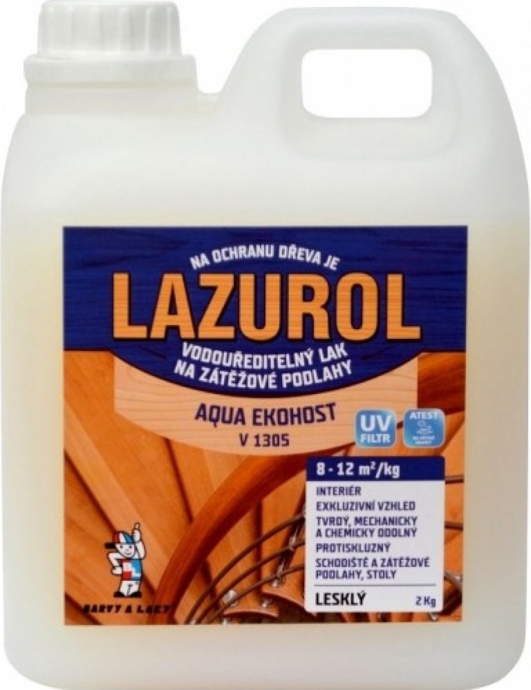 LAZUROL AQUA EKOHOST je vysoce procentní polyuretanový vodouředitelný podlahový lak s vysokou odolností, tvrdostí a efektním vzhledem, zvýrazňuje kresbu dřeva. Používá se pro nátěry dřeva v interiérech (nábytek, parkety, korkové krytiny) a pro nátěry savých materiálů (dřevovláknité desky, překližky). Obsahuje UV filtr. Vyrábí se jako bezbarvý lak v polomatném a matném provedení. Splňuje podmínky protikluznosti.