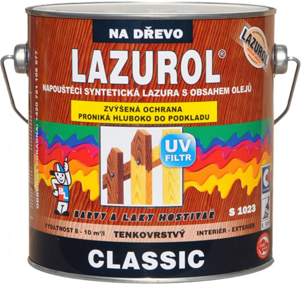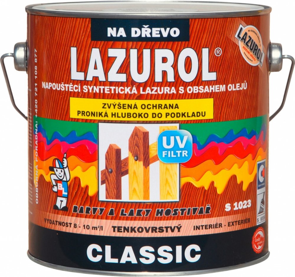 Lazura na dřevo S1023 je určena k ochranným lazurovacím nátěrům měkkého i tvrdého dřeva, vystaveného povětrnostním vlivům i k nátěrům v interiérech. Chrání dřevo před účinky UV záření. Obsahuje přírodní olej. Lazura na dřevo hluboce proniká do struktury dřeva, zvýrazňuje jeho přirozenou kresbu a tím poskytuje vysoce efektní nátěry. Vyznačuje se velmi snadnou obnovitelností starého nátěru. Odstín 0000 - bezbarvý je určen pouze pro použití v interiéru!!
