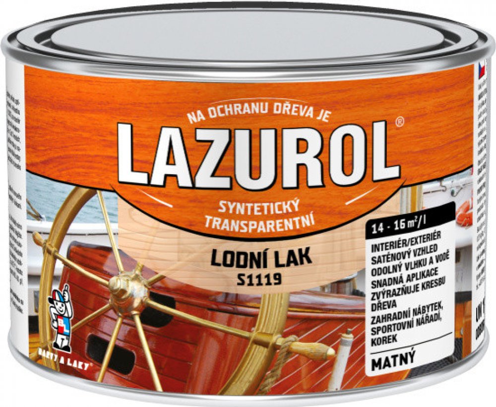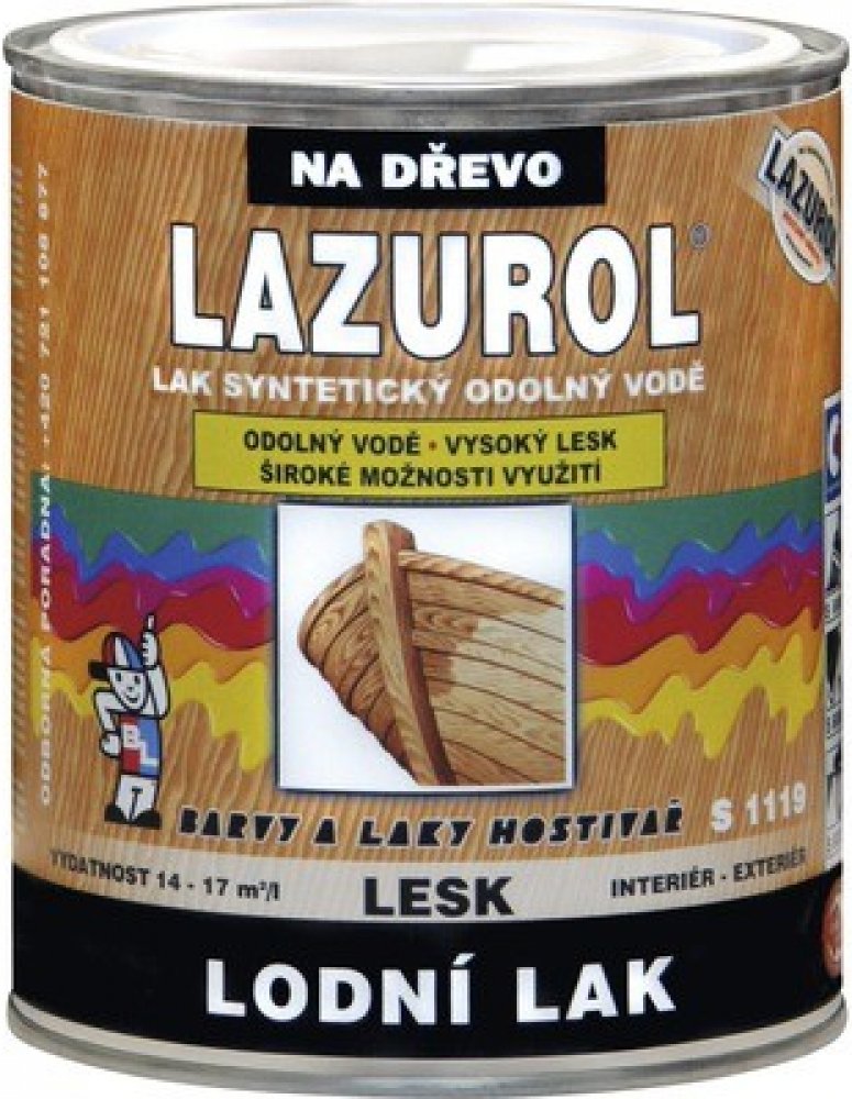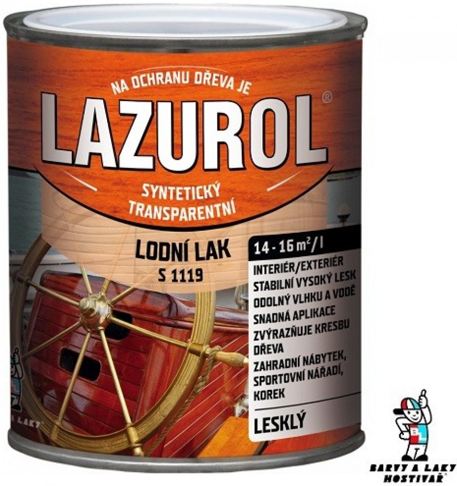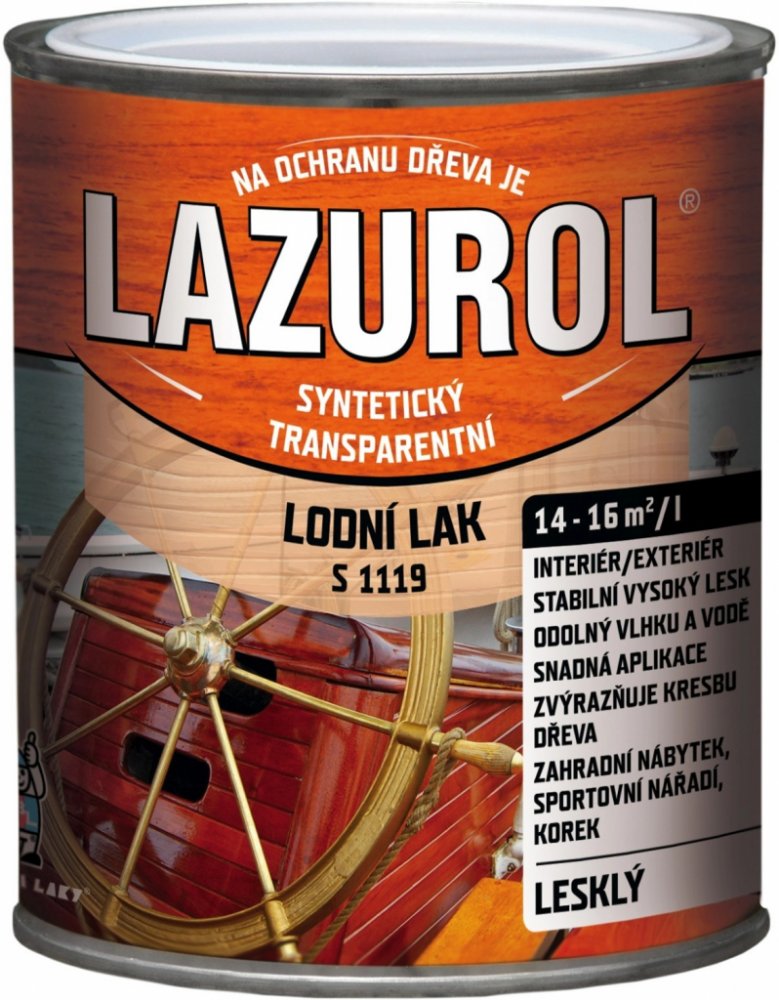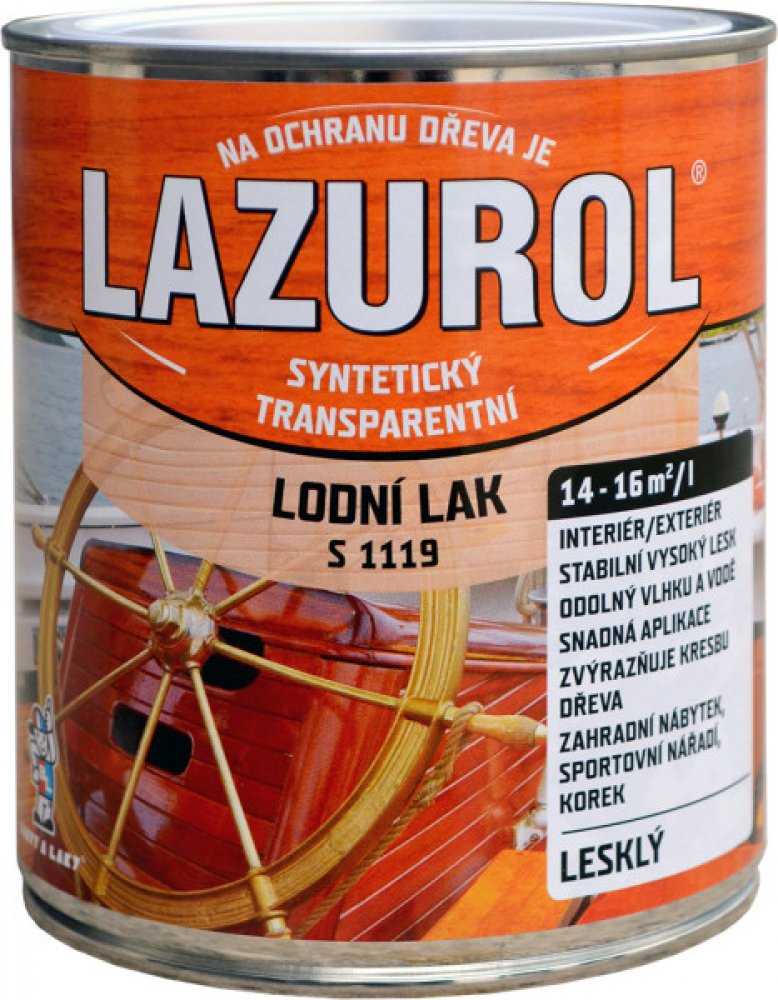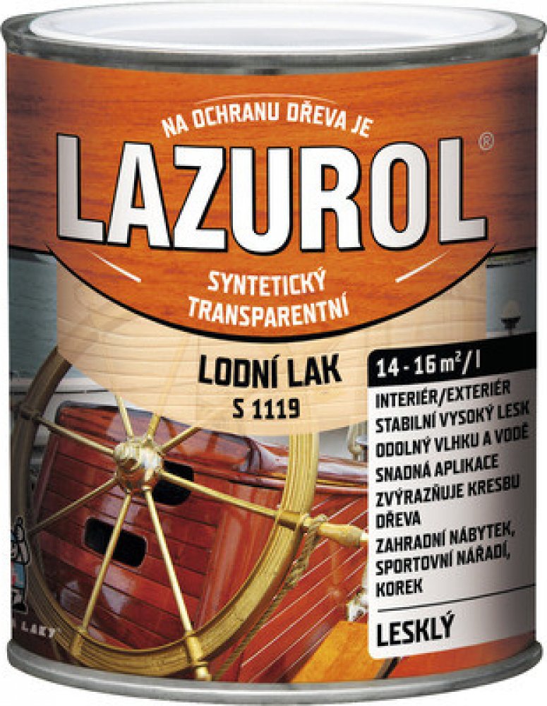 Použití Lazurol s1119 lodní lak na dřevo:Podklad: dřevo, dřevovláknité desky, korek. Prostředí: interiér, exteriér. Příklady: dekorativní nátěry všech dřevěných stavebních prvků ve vlhkém prostředí, dřevěné obložení, zahradní nábytek atd.