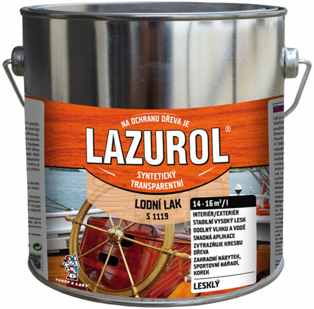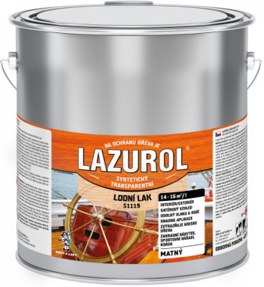 2. 2x lak syntetický LAZUROL a reg; Lodní lak S 1119. Druhý a další nátěr lakem je možno provádět za 24 hodin.
