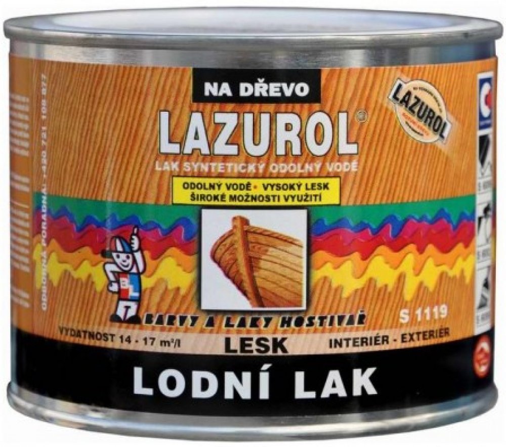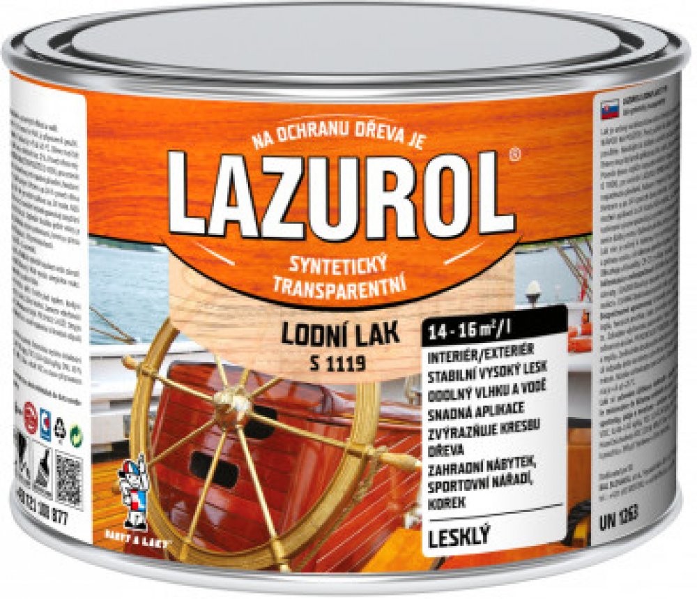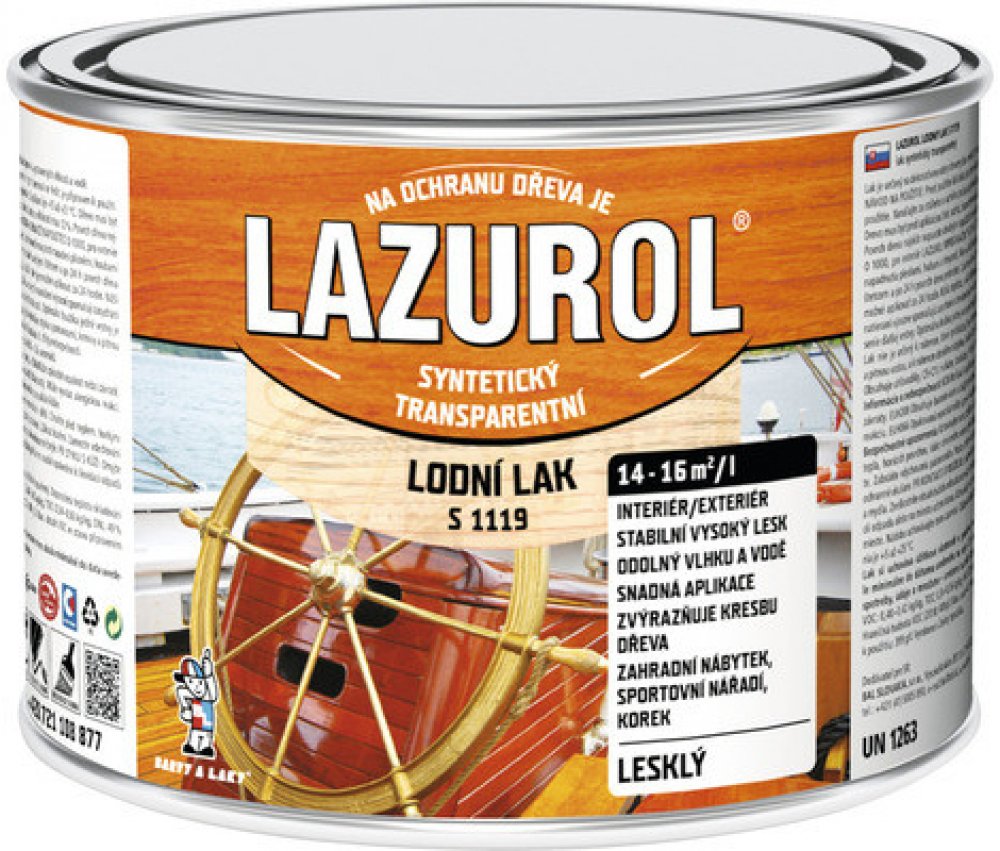 2. 2x nátěr lakem LAZUROL LODNÍ LAK S1119. Druhý a další nátěr lakem je možno provádět za 24 hodin. Optimální tloušťka jedné vrstvy nátěru je 25-30 µmBezpečnostní upozornění produktu (H-věty)EUH066: Opakovaná expozice může způsobit vysušení nebo popraskání kůže.EUH208: Obsahuje (viz nebezpečné látky). Může vyvolat alergickou reakci.H226: Hořlavá kapalina a páry.H319: Způsobuje vážné podráždění očí.H336: Může způsobit ospalost nebo závratě.Pokyny pro bezpečné zacházení (P-věty)P101: Je-li nutná lékařská pomoc, mějte po ruce obal nebo štítek výrobku.P102: Uchovávejte mimo dosah dětí.P210: Chraňte před teplem, horkými povrchy, jiskrami, otevřeným ohněm a jinými zdroji zapálení. Zákaz kouření.P261: Zamezte vdechování prachu/dýmu/plynu/mlhy/par/aerosolů.P271: Používejte pouze venku nebo v dobře větraných prostorách.P280: Používejte ochranné rukavice/ochranný oděv/ochranné brýle/obličejový štít.P302+P352: PŘI STYKU S KŮŽÍ: Omyjte velkým množstvím vody a mýdlaP337+P313: Přetrvává-li podráždění očí: Vyhledejte lékařskou pomoc/ošetření.P403: Skladujte na dobře větraném místě.P501: Odstraňte obsah/obal dle instrukcí na výrobku.