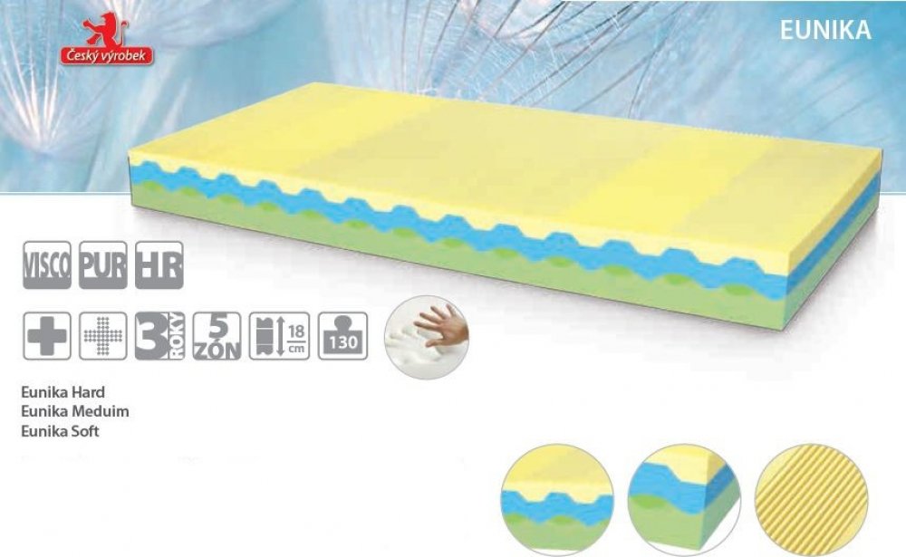 Matrace EUNICA je vysoce kvalitní a nelepená matrace, kdy unikátní profil každé vrstvy matrace umožňuje, aby tyto vrstvy k sobě nebyly lepeny, jsou pouze složeny a zapadají do sebe. Matrace tak neobsahuje lepidlo a složky, které pro některé osoby mohou působit dráždivě. Proto může být doporučována pro alergiky, astmatiky a pro všechny osoby, které jsou citlivé. Horní vrstva matrace je z komfortní termoreaktivní (líné) pěny a zákazník má možnost si vybrat ze tří tvrdostí (Hard, Medium, Soft). Speciální tvarování matrace a výška jádra 18 cm umožnuje vysoce komfortní spánek i na nepružném podkladu. Vyobrazená matrace je v zákaznicky nejoblíbenějším provedení Medium, tuhost Hard se liší pouze horní vrstvou, která je z tvrdší Visco pěny růžové barvy, tuhost Soft se liší pouze horní vrstvou, která je z měkčí Visco pěny bílé barvy. Výška jádra 18 cm. Výška jádra matrace EUNICA je18 cm. Vhodné uložení matrace EUNICA: Ideální uložení matrace v potahu je na lamelový rošt (polohovací i nepolohovací variantu). Dosáhneme tak vhodné spolupráce pružných lamel s matrací. Napomohou k ideálnímu rozložení váhy a dosáhneme tak zdravého odpočinku. Možné uložení matrace je na laťový rošt (polohovací i nepolohovací variantu) a perforovanou desku, kdy zajistíme matraci cirkulaci vzduchu. Potah matrace : Alexandra plus uz,vzor 300g s 3D mřížkou je snímatelný a pratelný na 60 °C. Potah nesušit v sušičce. Do potahu je všitý zip je po celém obvodu a dá se rozdělit na dvě samostatné části.