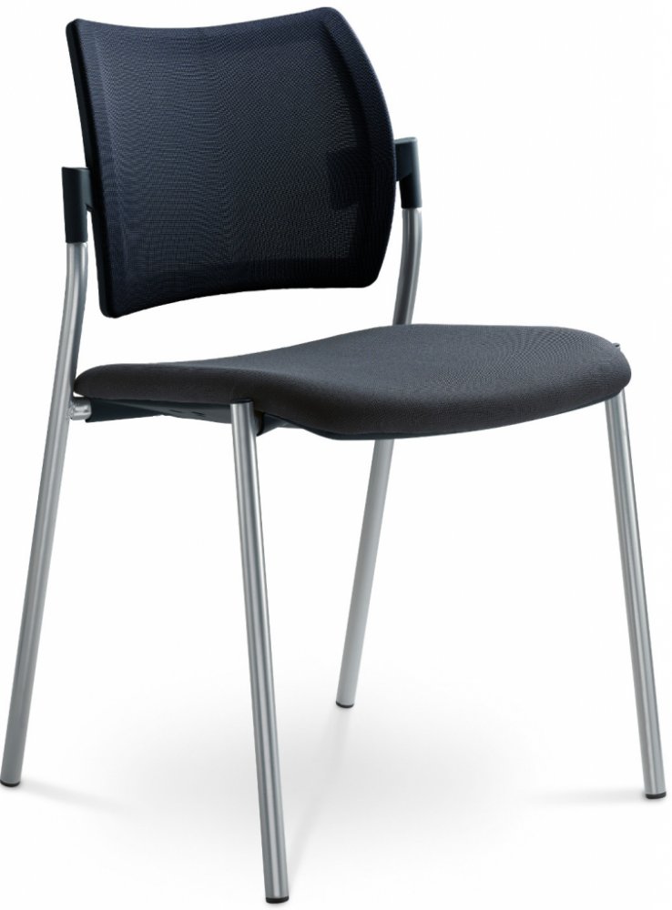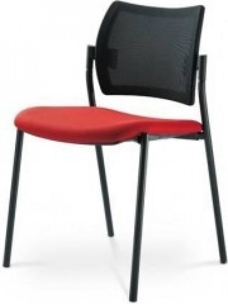 Konferenční židle stohovatelná, kostra ocelová čtyřnohá v barvě N1 černá, N2 efekt hliník nebo N4 chrom, opěradlo černá síťovina, bez područek, černé krycí plasty sedáku a opěráku a černé záslepky zádového uchycení opěráku.