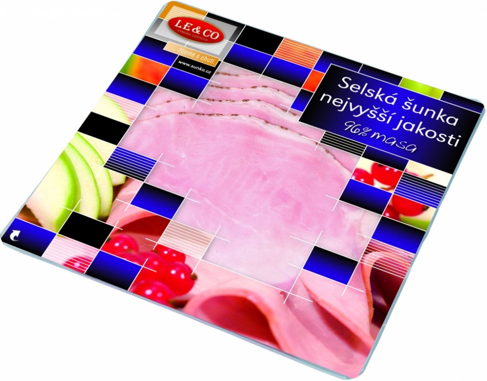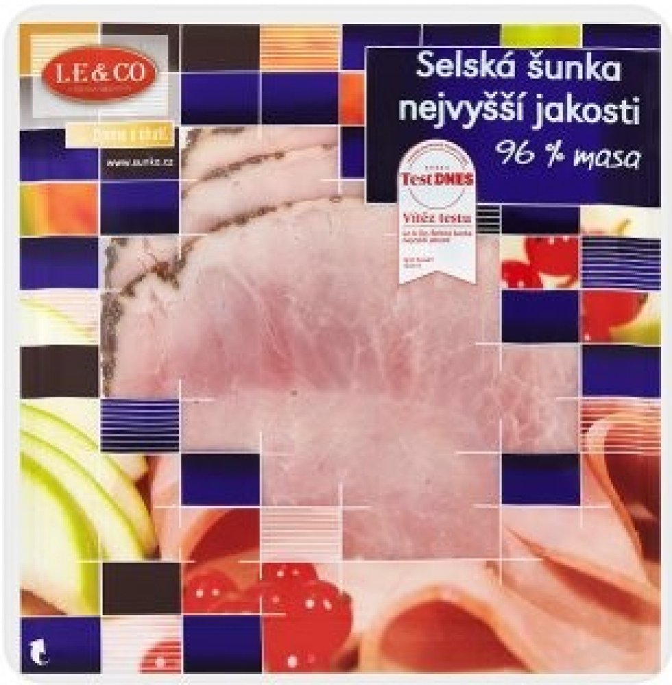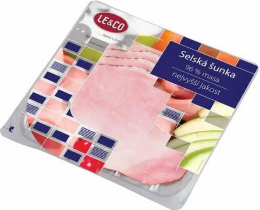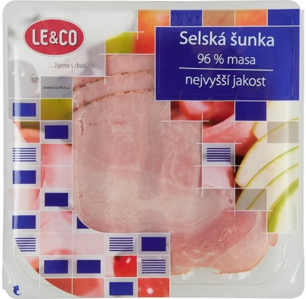 96 % masa, Le & CoVýroba uzenin... žijeme s chutí., Nezávislý test MLADÉ FRONTY DNESTest DNESVítěz testuLe & Co, Selská šunka nejvyšší jakostiTest šunky 12/2015, Selská šunka nejvyšší jakosti, 96 % masa. Masný výrobek tepelně opracovaný, šunka nejvyšší kvality, zauzená., Baleno v ochranné atmosféře.,