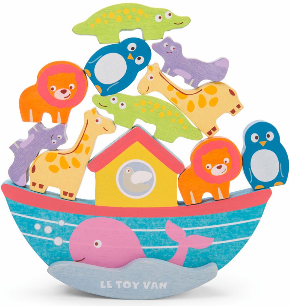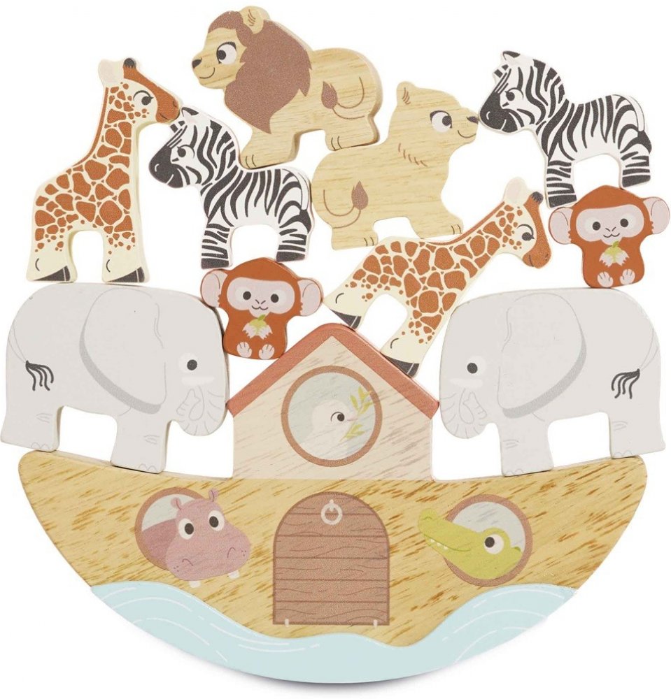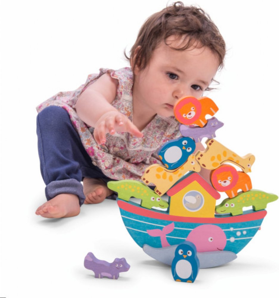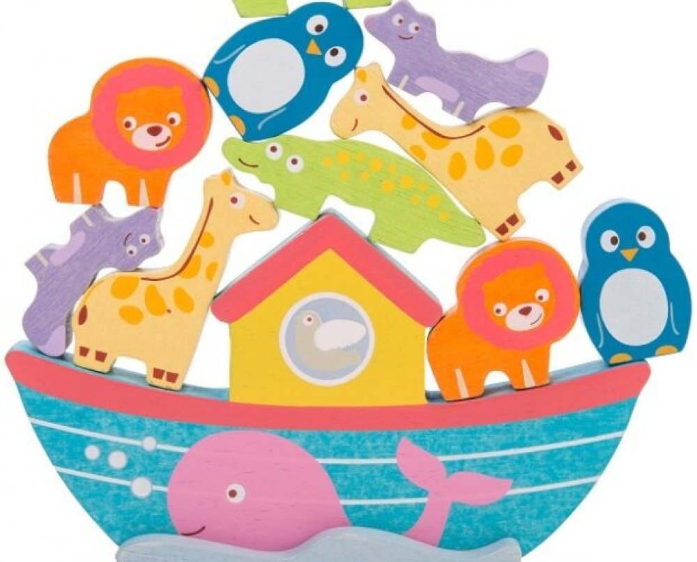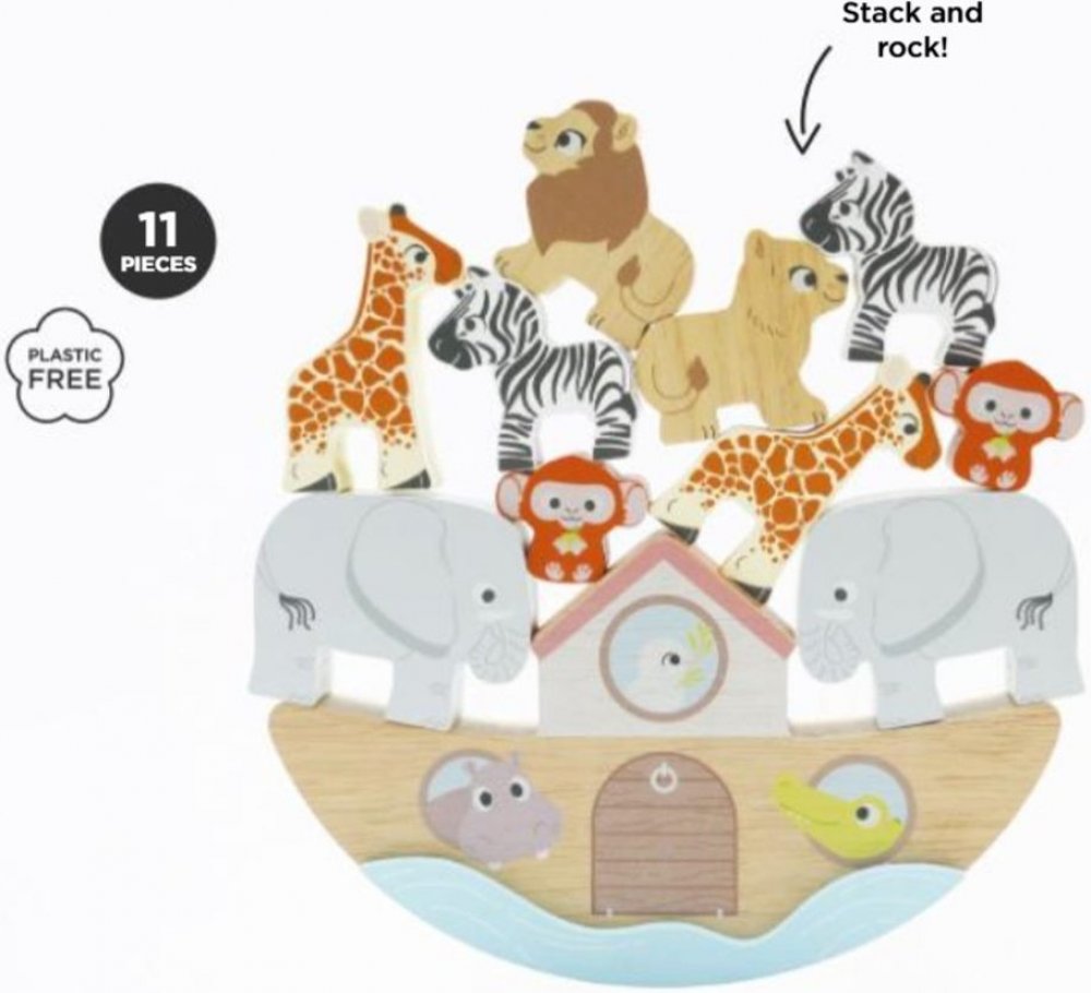 Krásná dřevěná archa s 10 dřevěnými zvířaty, která se houpe. Děti nadchne, budou hledat 5 párů zvířat, které k sobě pasují. Jak vysoko dokážou děti jednotlivé dílky naskládat než se balanční archa rozhoupe?