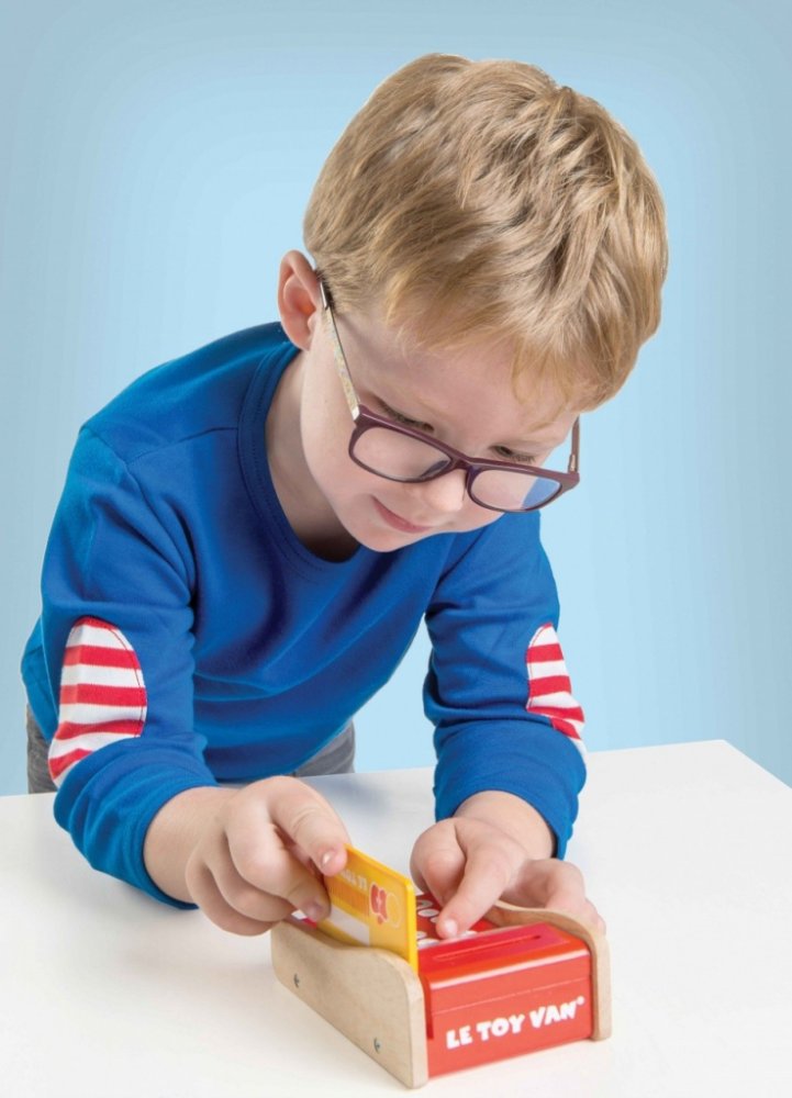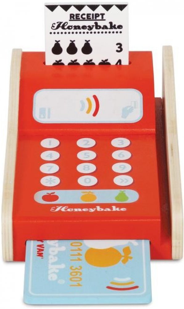 Perfektní pro dětské prodejní trhové stánky, tento platební terminál pomůže dětem zlepšit jejich znalost číslic, zároveň si užijí mnoho zábavy s představivým prodejem. Platební terminál má stejnou barvu jako Le Toy Van Pokladna, pěkně se tak doplňují. V balení také 1 účtenka a 1 platební karta. Účtenky navíc si děti mohou vystřihnout z kartonové krabice. Produkt se může lišit v barevných detailech.