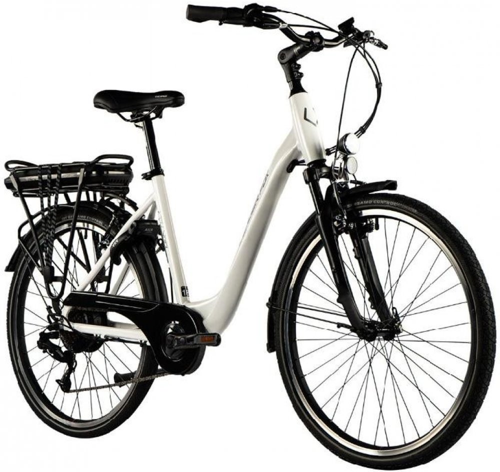Městské elektrokolo LATONA je vybaveno přední odpruženou vidlicí, díky které zvládnete pohodlný přejezd po dlažebních kostkách i městských výmolech. Pro jízdu ve tmě je připraveno kvalitní přední LED osvětlení. Svou tašku s nákupem nebo kabelku bezstarostně převezete na pevném zadní nosiči.