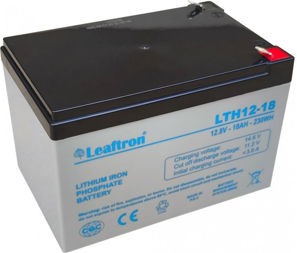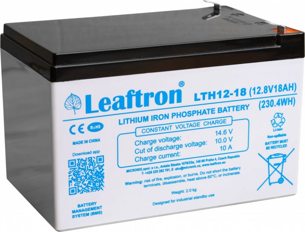 Lithiová baterie - záložní, bezúdržbový, Lithiový, uzavřený akumulátor. Technologie LITHIUM (LifePO4). Lithium-železo-fosfátové akumulátory představují velké zlepšení parametrů ve srovnání s technologií olovo-kyselina. Akumulátor je určený nejen pro záložní zdroje UPS, EZS, EPS, ale také například elektrické vozíky a zařízení s cyklickým provozem. Výhradní dovozce akumulátorů Leaftron je firma MICRONIX, spol. s r.o. Akumulátory mají až 5x delší životnost než olověné akumulátory a mohou být užívány pro více než 3000 cyklů vybití. Tak jako ostatní lithiové baterie Leaftron jsou tyto akumulátory nejen bezúdržbové, uzavřené, ale také inteligentní a pracující v jakékoli poloze. Výhody oproti AGM: Větší kapacita - poskytuje až 100 % využitelné energie Nízká hmotnost - až o 60 % nižší v porovnání s olověnými akumulátory Rychlé nabíjení - mnohem rychlejší nabíjení než u běžných olověných baterií Modulární propojení - 4 ks sériově, 6 ks paralelně Dlouhá životnost - více jak 15 let v závislosti na počtu cyklů a hloubce vybití Inteligentní systém BMS - monitoruje a maximalizuje výkon a bezpečnost Vyšší počet cyklů - více než 3000 cyklů při 100 % hloubce vybití Nabíjení - není potřeba speciální nabíječka - akumulátor si díky BMS systému sám řídí nabíjecí proces Počty cyklů v závislosti na hloubce vybití 30% vybití - 12000 cyklů 50% vybití - 6000 cyklů 80% vybití - 4500 cyklů 100% vybití - 3000 cyklů