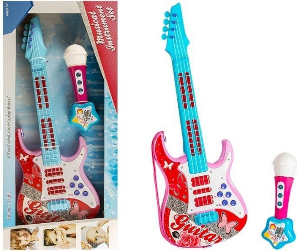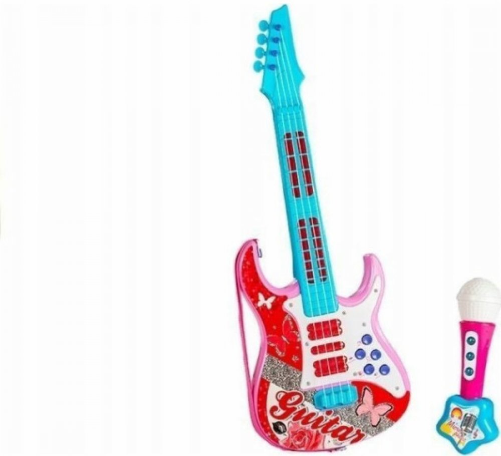Kytara a mikrofon pro malé rockery! Tato barevná hračka rozvíjí dětskou kreativitu a hudební talent. ❤️ plastová konstrukce, motivy motýlů, růží a třpytivých prvků dodávají kouzlo.