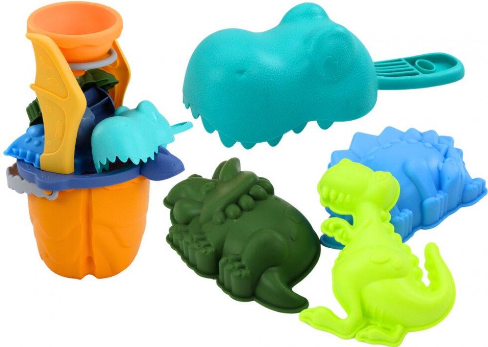 Lean Toys Sada na písek s dinosaury trychtýř mlýnek formičky špachtle 7 kusů.