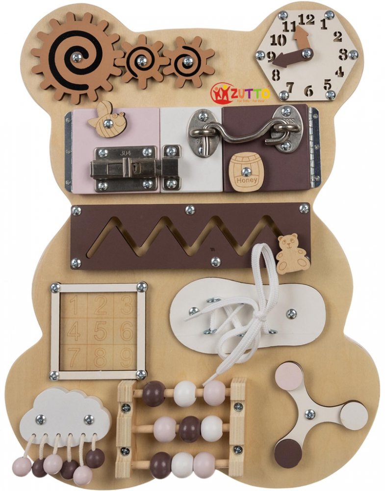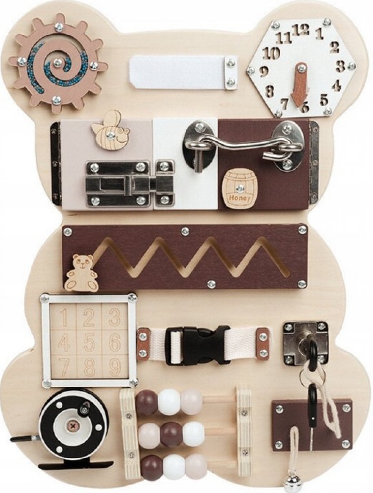 Senzorická manipulační deska Dřevěný medvídek 14 El Senzorická manipulační deska ve tvaru roztomilého medvídka je dokonalou pomůckou pro podporu vývoje kojenců a batolat. Hračka je vyrobena z odolného dřeva a je plná různých prvků, kombinuje vzdělávání s radostí a nabízí batolatům spoustu příležitostí ke zkoumání a hře. Deska obsahuje 14 různých smyslových prvků, které zapojují smysly a podporují rozvoj motoriky. Mezi nimi jsou hodiny s pohyblivými ručičkami, které dětem umožňují hrát si na učení a rozvíjet koordinaci ruka-oko. Suchý zip a boční spona jim pomáhají naučit se zapínat a rozepínat, což podporuje zručnost prstů. Dalším zajímavým prvkem je ozubené kolečko, které se otáčí o 360, což dětem umožňuje hrát si s mechanismy a rozvíjet manipulační dovednosti. Otevírací dveřní západka, dveřní háček a řetízková západka seznamují batolata s různými typy spojovacích prvků, zatímco nábytková západka je učí ovládat základní mechanismy. Součástí desky je také bludiště s pohyblivou postavičkou, které zlepšuje manuální dovednosti a soustředění, zatímco čísla ve čtverci podporují výuku počítání a rozpoznávání čísel. Děti si mohou hrát také s plastovou sponou, zámkem na klíče a zvonečkem na provázku a posuvnými korálky, které rozvíjejí manuální dovednosti a koordinaci. Otáčecí kolo se zvukem zapojuje sluch a hmat a poskytuje další vrstvu zábavy. Tato dřevěná senzorická deska ve tvaru medvídka je nejen estetická a robustní, ale také bezpečná pro děti. Každý kus byl pečlivě navržen tak, aby podporoval všestranný rozvoj dítěte - od manuálních dovedností až po koordinaci a kognitivní schopnosti. Je to ideální volba pro dárek, který spojuje učení se zábavou a zajišťuje batolatům radost a uspokojení z objevování nových dovedností. Rozměry desky: rozměry balení: 39 cm x 30 cm x 9 cm: je certifikovánaa splňuje také normu EN71. Vhodné pro děti starší 3 let.