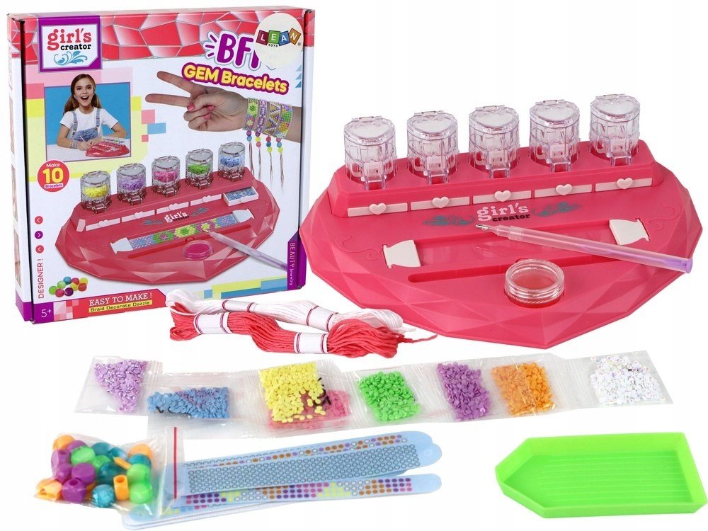 Vytvořte si vlastní blyštivé náramky s kreativní sadou pro děti od 5 let. Srdíčková stanice s organizérem, korálky, „diamantovými“ kamínky a šňůrkami umožní navrhnout až 10 originálních náramků. Jednoduché vyklepávání a lepení kamínků, rozvoj jemné motoriky a kreativity a přehledné uložení materiálu potěší každou malou návrhářku.
