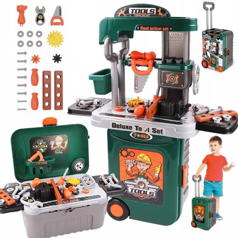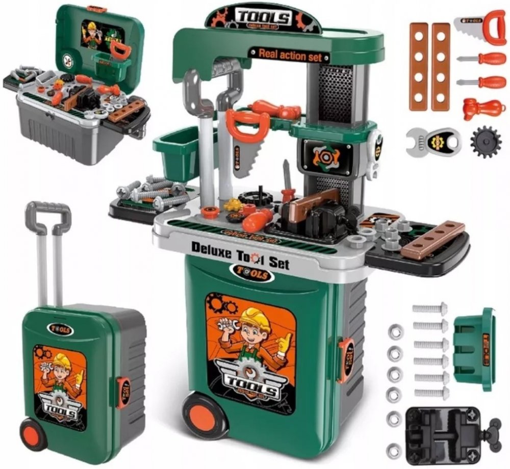 Pokud vaše dítě rádo pomáhá tátovi s jeho řemesly, bude to pro něj perfektní přenosná sada. Dílna v kufru je perfektní věc, teď si ji může vzít všude s sebou. Prodloužitelná rukojeť a kolečka na zadní straně vám umožní tahat za sebou. Po otevření kufru jsou uvnitř všechny prvky pro vytvoření vlastní dílny. Nezabere moc místa. Největší výhodou setu je velké množství prvků, díky kterým si dítě bude moct šťourat a opravovat mnoho hraček.