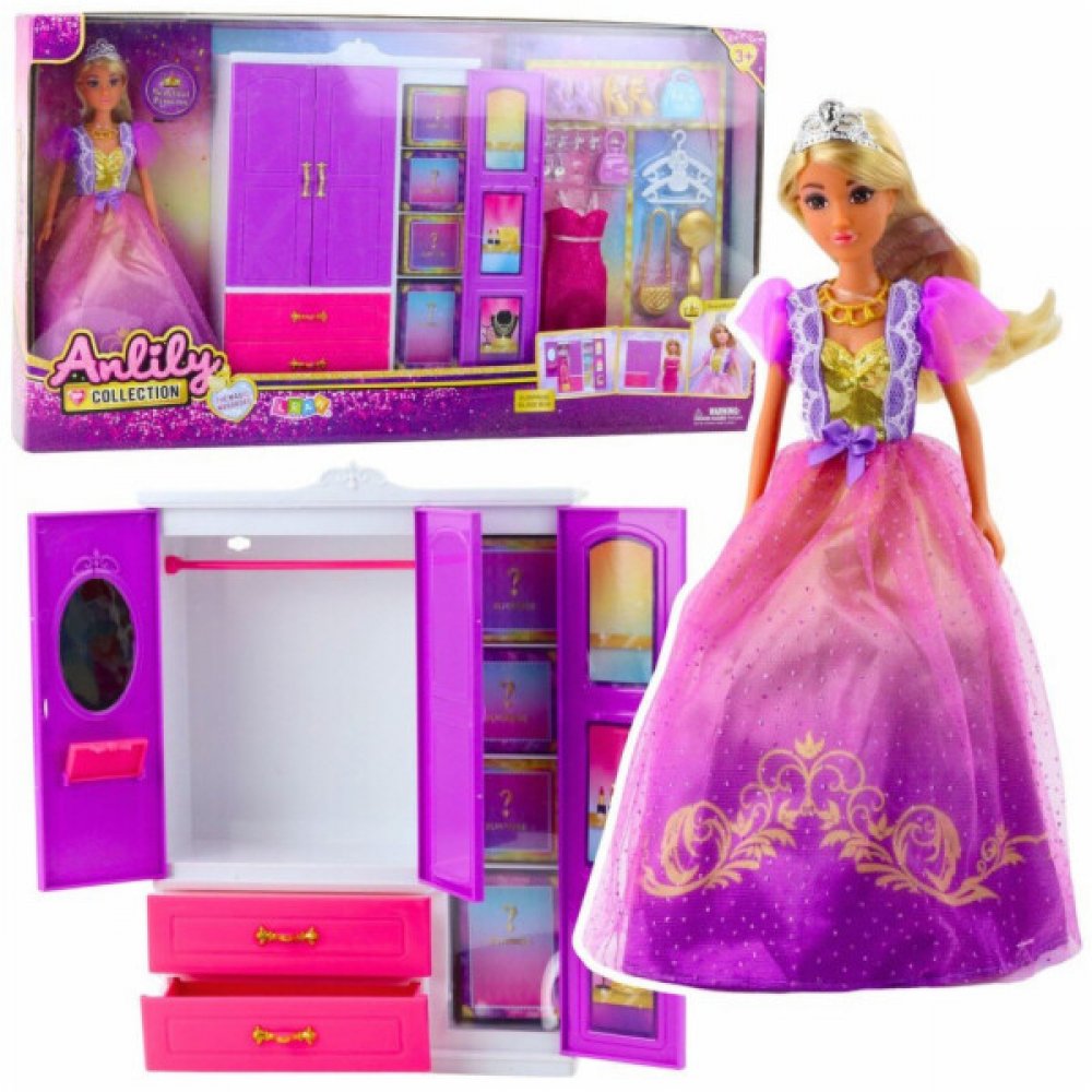 LeanToys Šatní skříň pro panenky Anlily s policemi a zásuvkami, doplňky do šatny