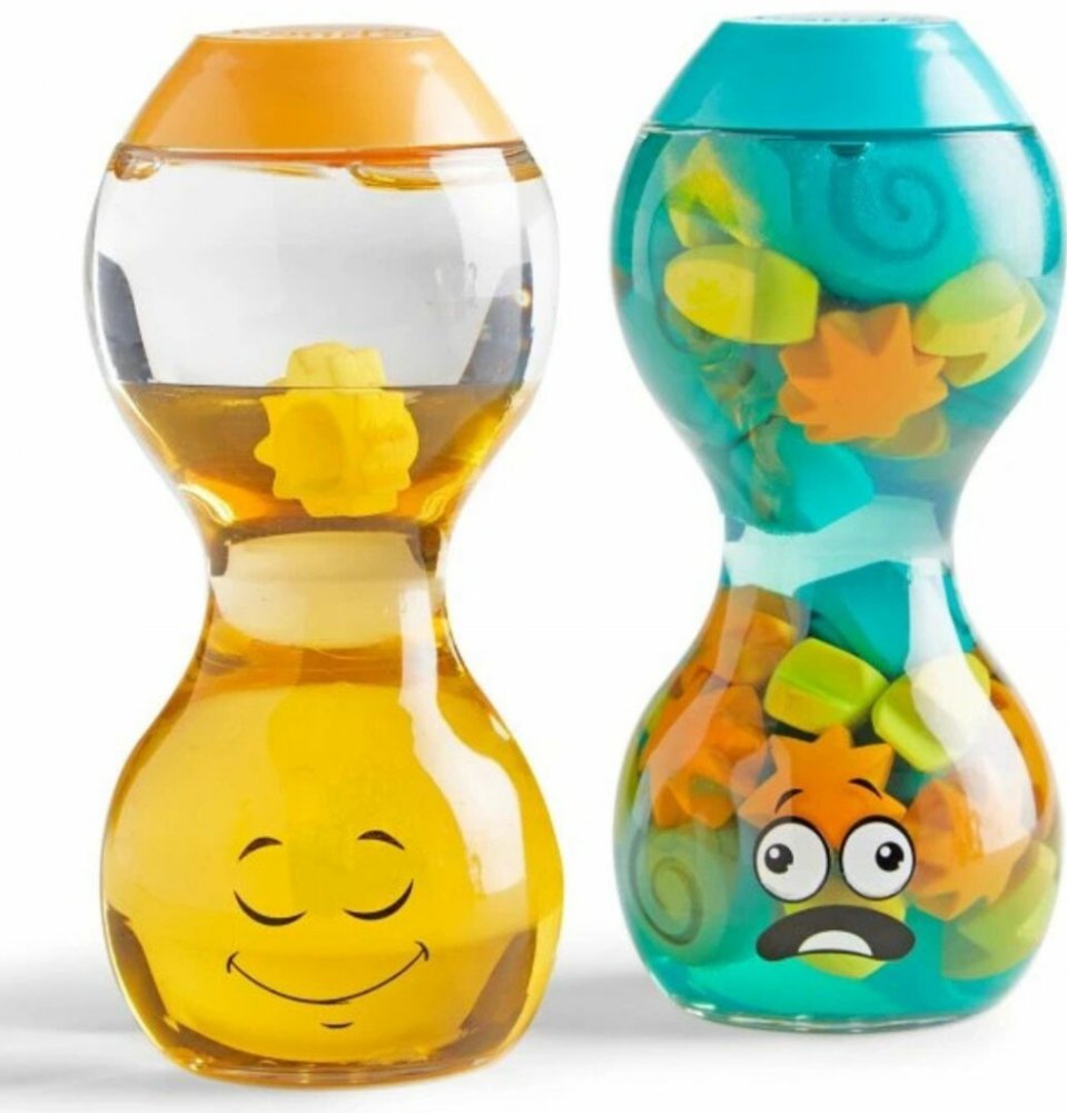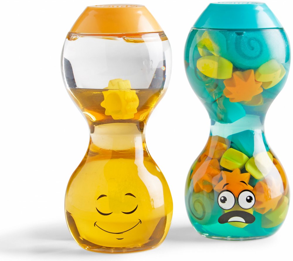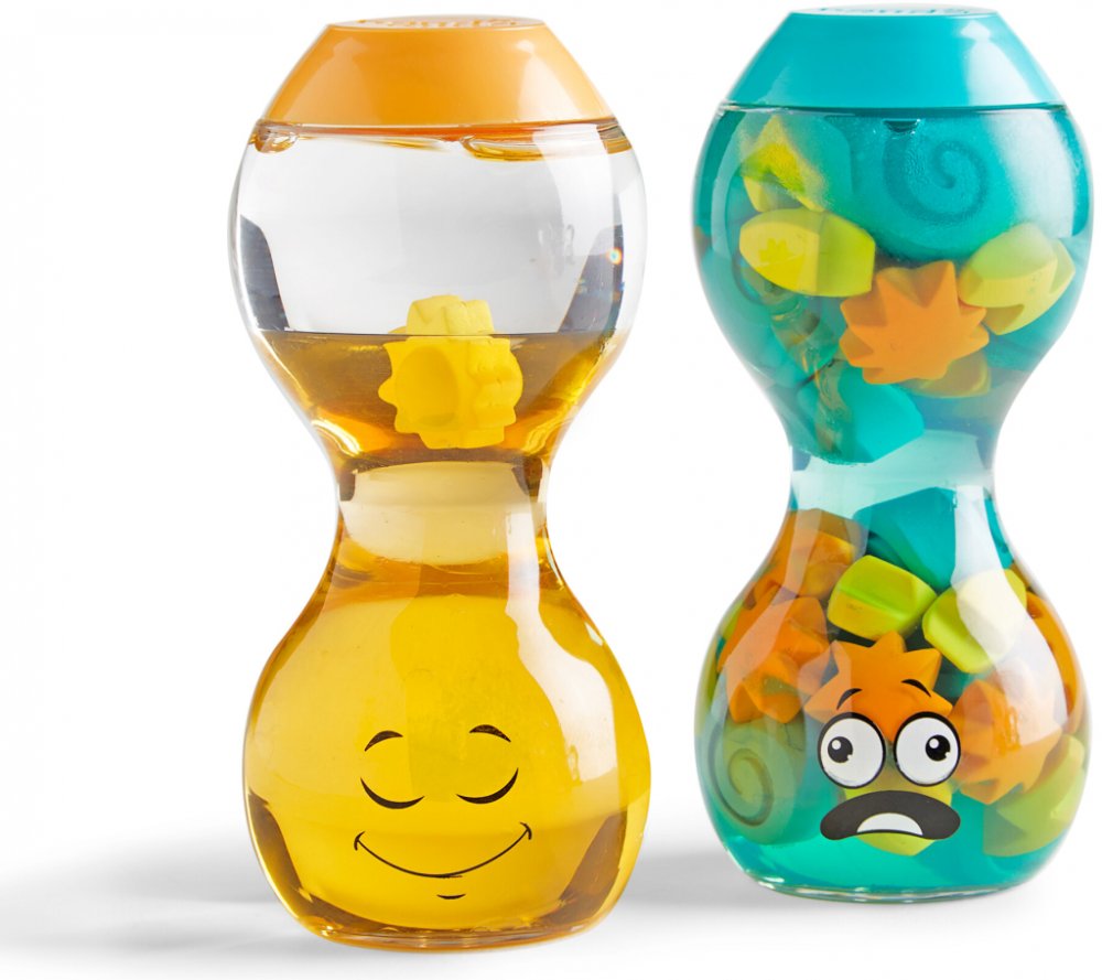 Tato senzorická sada značky Hand2Mind nabízí dětem možnost porozumět protichůdným emocím formou hry. Lahvičky naplněné barevnou kapalinou se pohybují a víří způsobem, který vyjadřuje rozdíl mezi emocemi jako je např. klid a vzrušení, radost a smutek nebo uvolnění a napětí.