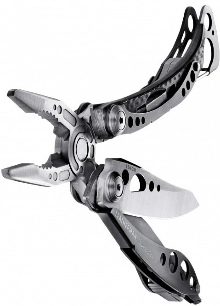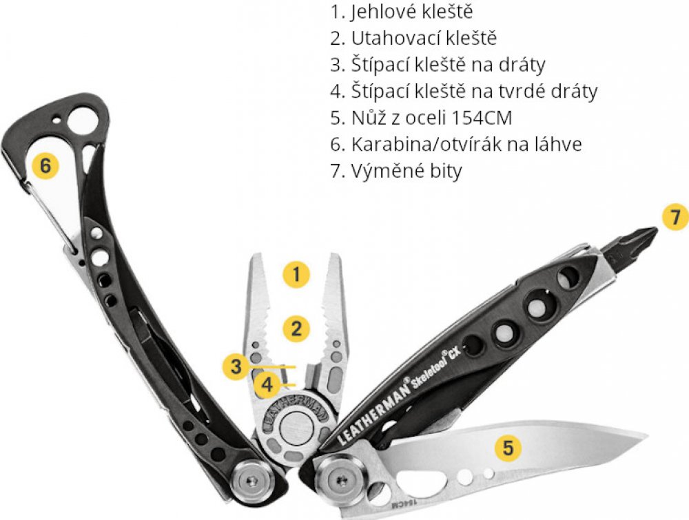 - 7 Základních Nástrojů: Skeletool CX obsahuje jehlové kleště, běžné kleště, řezačky tvrdého drátu, řezačky drátu, nůž z 154CM nerezové oceli, karabinu/otvírák lahví a velký držák bitů.