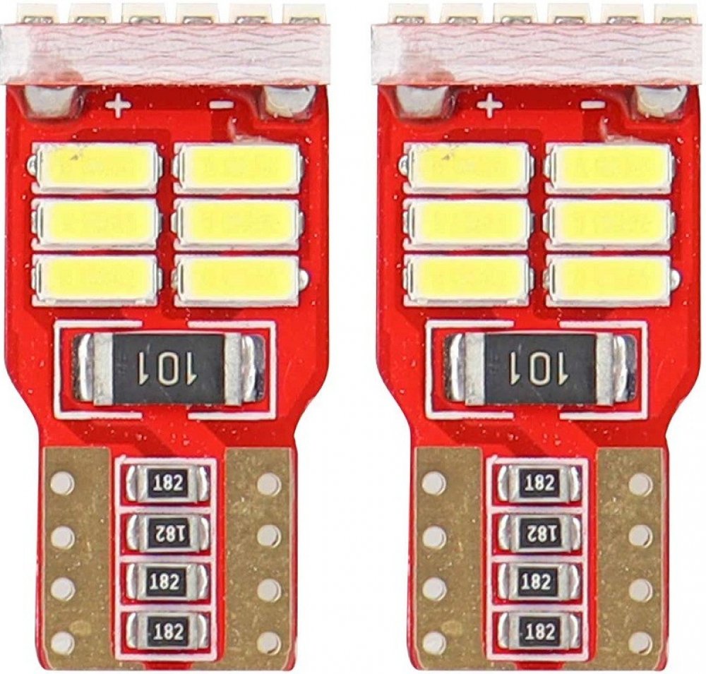 Náhradní LED žárovky s paticí T10, bílé, s vestavěným rezistorem (nehlásí závady řídící jednotky na žárovce u nových vozidel), 18x vysocesvítivá SMD LED dioda, napájecí napětí 12V, vhodná do parkovacích světel u novějších vozidel, odpovídá žárovce "celosklo" W5W. Díky teplotě světla 6000° K jsou LED žárovky ideálním doplňkem do reflektorů s xenonovými výbojkami, kde žluté světlo obyčejné žárovky působí rušivě.
