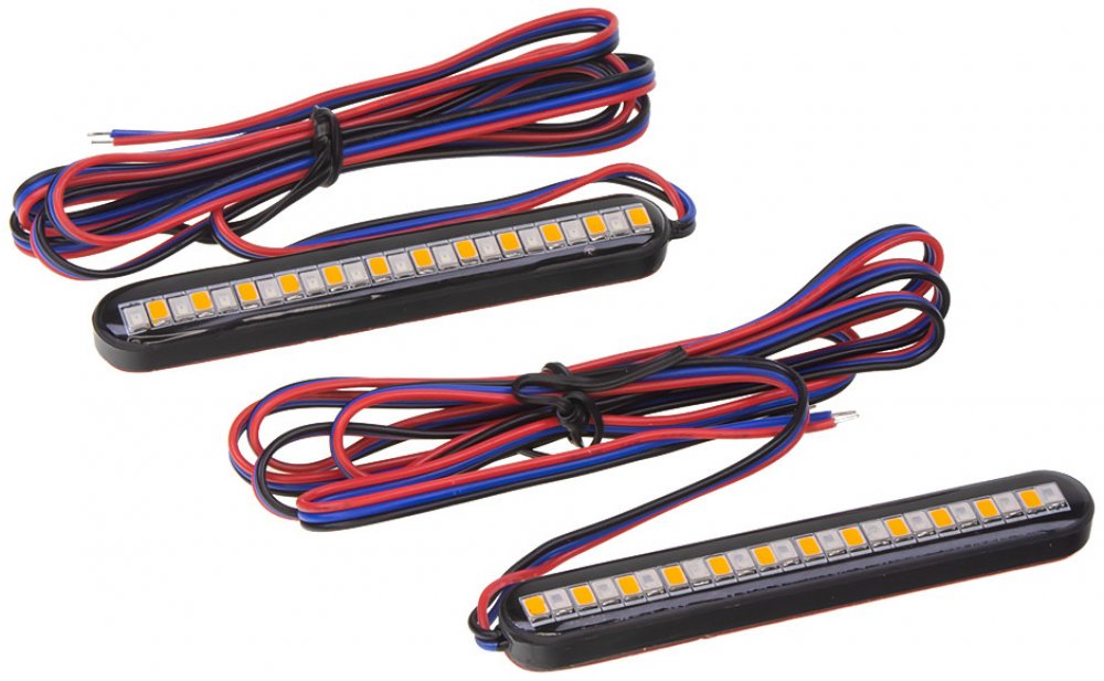 Miniaturní univerzální LED blinkry (směrová světla) + brzdové světlo pro motocykl nebo jiné použití.
