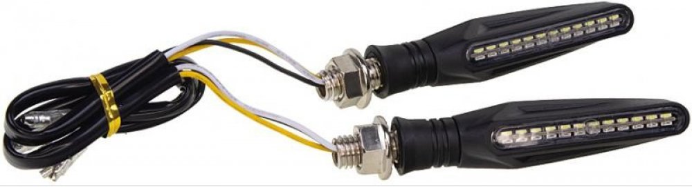 SVĚTLA - ŽÁROVKY - LED > Speciální světla > LED blinkry Univerzální LED blinkry (směrová světla) + denní svícení pro motocykl.Blinkry dynamicky blikají (běžící světlo), stejně jako u některých moderních automobilů.Denní svícení po rozsvícení dynamicky zabliká a rozsvítí se. Technické parametry:• napájecí napětí: 12 V• proudový odběr: max 0,1A• 24x vysoce svítivé SMD LED• směrové světlo bliká i bez přerušovače• rozměry: 85 x 19 x 23 mm, délka včetně šroubu 105 mm• uchycení: šroub M10• odolné plastové tělo s gumovým uchycením• bez homologace Balení obsahuje 2ks - cena za 2ks
