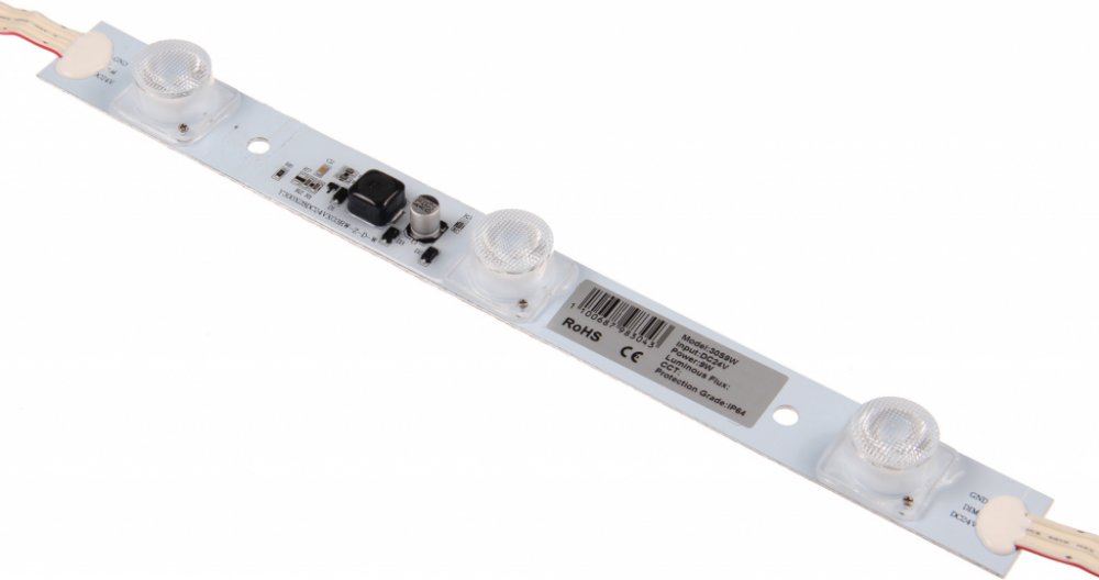 LED moduly s krytím IP64 jsou určené pro světelnou reklamu a další LED aplikace pro reklamní účely, především je určeno pro užití osvětlení světelných boxů (lightboxy). Moduly jsou osazeny čipy s boční optikou a úhlem svitu 15*45° pro nasvícení reklamních boxů, kdy jsou moduly nainstalovány z boků světelného boxu. LED moduly 3OS9W mají dlouhou životnost, vysokou svítivost a použití nová technologi...