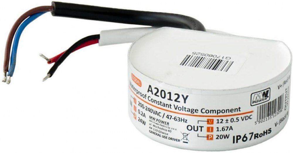 Exteriérový zdroj je vhodný jak pro napájení LED pásků, tak i LED žárovek určených pro napětí 12V.Je také vhodný pro venkovní použití. Ø58x25mm - lze umístit do hluboké elektroinstalační krabice.Příkon připojených LED pásků nebo LED žárovek by neměl přesahovat daný výkon zdroje.V takovém případě vždy volte zdroj o vyšším výkonu !Technické údaje:Napětí12VVýkon20WProud na výstupu1,66ATypelektronický, stabilizovanýUrčeníinteriér, exteriérCertifikátyCE a RoHS, krytí IP67Rozměr Ø58x25mm