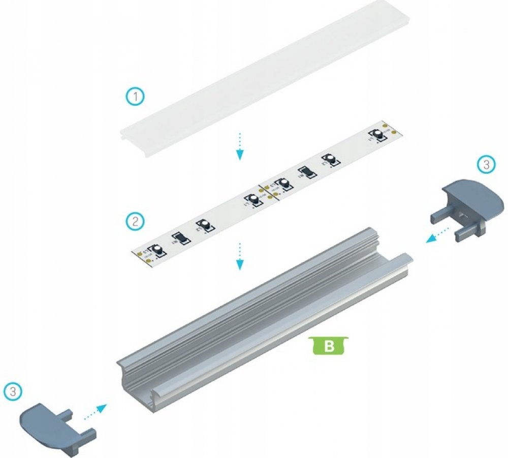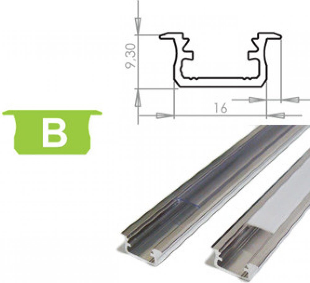 Hliníkový profil LUMINES B pro zapuštění do otvorů vyfrézovaných do povrchu.Jeden z nejminimalističtějších a nejmodernějších designů.Ideální pro montáž do vyfrézovaného otvoru. Minimální požadovaná hloubka otvoru je pouhých 9 mm.Způsob montáže:- vtlačením do vyfrézovaného otvoru nebo montážním lepidlemBarevné varianty:- surové,- eloxovaná stříbrná- eloxovaná černá,- eloxovaný inox,- lakovaná bílá (RAL9016)Montáž- oboustranná páskaPříslušenství:- difuzor PVC BASIC: mléčný, matný, průhledný- difuzor PMMA Basic - průhledný, matný, mléčný, matný, čočka 15, čočka 30, černý- difuzor Basic PC - průhledný, matný, mléčný(násuvná sestava shora)- ploché koncovky ABS v 5 barvách-šroubovací krytky s kulatým povrchem ABS v 5 barvách-koncové krytky na míru z hliníku s kulatým povrchem ve 3 barevných variantách- bezdotykový spínačK dispozici jsou profily v profilech: 1000 mm, 2020 mm, 3000 mm.Delší délky lze zakoupit po kontaktování servisního oddělení.Pokyny k instalaci zapuštěného profilu B s difuzorem BASICKonečný výsledek montáže zapuštěného profilu B s difuzorem BASICZpůsoby montáže profilů B uvnitř vyfrézovaných otvorů na příkladu schodůMontáž profilu B uvnitř vyfrézovaného otvoru (1) s plochým uzávěrem, (2) s kulatým uzávěremAxonometrický pohled před instalací profilu B do vyfrézovaného otvoru (1) s plochou zátkou, (2) s kulatou zátkouSpojení profilu B uvnitř vyfrézovaného otvoru pod úhlem 90°Schéma montáže osvětlovacího systému s použitím profilu B a (1) difuzoru BASIC, (2) pásku LED, (3) zaslepovací zátky s kulatým zakončením otvoru