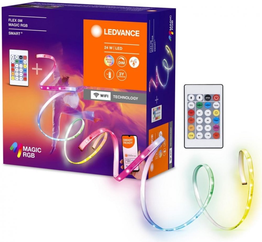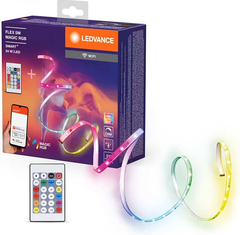 LEDVANCE SMART+ chytrý WiFi LED stmívatelný RGB pásek s ovládačem FLEX 5mDekorativní LED pásky s WiFi technologií a MAGIC RGB Výhody produktu Snadná a rychlá instalace Magic RGB barevné ovádání pro maximálně flexibilní výběrVlastnosti produktu Stmívatelné Řízení barev RGB Funkce DIY: Můžete nastavit barevný segment pro každý segment a vytvořit si vlastní světelné scény nebo jen použít již dostupné světelné scény Ovladatelné pomocí aplikace LEDVANCE SMART+ (minimálně Android 8.0 nebo iOS 14.0) Flexibilní, ohebné LED pásky