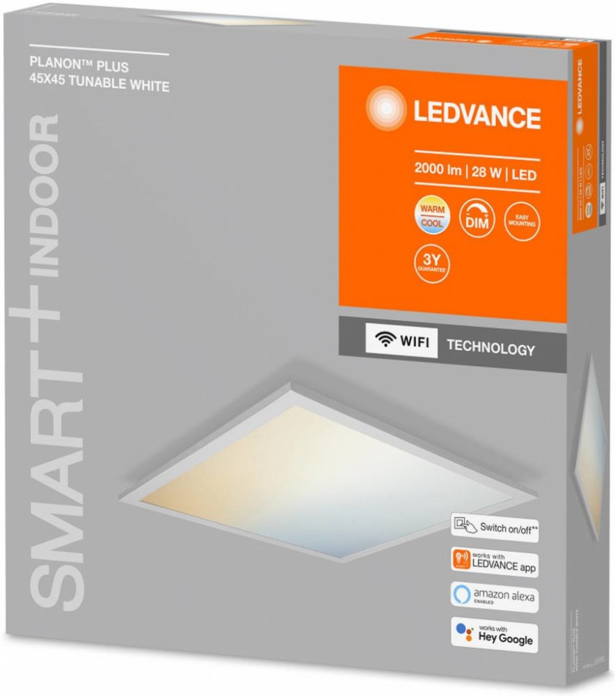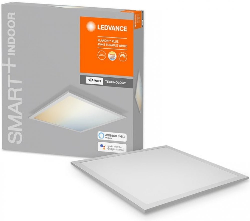 Čtvercový LED panel Planon Plus s nastavitelnou barvou světla a technologií LEDVANCE SMART+ WiFi Panel Planon Plus LED má plochý a hranatý design a skládá se z hliníkového krytu a difuzoru z PMMA. Díky jednoduchému designu lze stropní svítidlo použít v různých obytných prostorech. Ideální je například jako osvětlovací prvek na chodbě, v obývacím pokoji nebo také v ložnici či pracovně. Jas a teplotu barev lze měnit pomocí aplikace nebo hlasového příkazu. Svítidlo je integrováno přímo přes WLAN pomocí technologie LEDVANCE SMART+ WiFi. Technické údaje / kompatibilita: - Ovládání prostřednictvím aplikace LEDVANCE SMART+ WiFi (s minimálně Android 4.4 nebo iOS 9.0) zdarma; umožňuje přednastavení a automatizaci. - Možnost hlasového ovládání přes Google Assistant nebo Amazon Alexa (vyžaduje příslušný systém inteligentní domácnosti) - Stmívatelné - Nastavitelná teplota barvy: 3 000 K - 6 500 K - Síťový protokol: WiFi 2,4 GHz