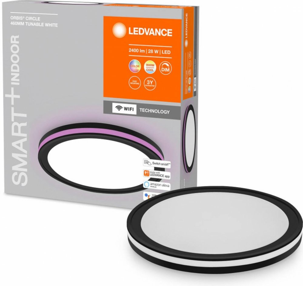 LEDVANCE SMART+ chytré stmívatelné WiFi LED RGBTW stropní svítidlo ORBIS CIRCLE 460mm s podsvícením, v černém provedení a s nastavitelnou bílou barvou světla. Úsporné kruhové stropní LED svítidlo ORBIS CIRCLE vypadá jako by se skládalo ze tří kruhů ležících na sobě. Má dva samostatně ovládatelné světelné zdroje, přičemž každý má jinou úlohu. Hlavní světlo s nastavitelnou teplotou bílé barvy a možností plynulého stmívání svítí klasicky směrem dolů, skrz hlavní difuzor z akrylátového skla. Skrz obvod svítidla, který je lemován dvěma černými kruhy z termoplastového materiálu, pak svítí do stran druhý zdroj, který má pouze barevné stmívatelné světlo a jeho úlohou je akcentové náladové osvětlení místnosti. Oba zdroje se dají ovládat z univerzálního bezdrátového dálkového ovladače LEDVANCE nebo díky napojení na WiFi síť přes mobilní aplikaci, případně hlasovými povely přes Amazon Alexa a Google Assistant. Dodáváno je včetně upevňovacích držáků, montážních šroubů a spojovacích kolíků. Výhody produktuÚsporné kulaté LED stropní svítidlo pro vytváření barevných akcentů na vnějším obvodě svítidla. Možnost volby barevného světla a individuální nastavení teploty bílé barvy světla. Instalace svítidla je velmi jednoduchá a intuitivní, stejně jako připojení k WiFi, a zvládne ji i naprostý laik. Svítidlo lze pohodlně ovládat dálkovým ovladačem nebo odkudkoliv přes aplikaci LEDVANCE, případně hlasovým ovládáním Amazon a Google. Snadnou integrací svítidla do domácí WiFi sítě získáte další SMART funkce, jako je např. časové spínání nebo automatizované ovládání včetně začlenění do rutinních činností. Díky vyspělé a úsporné LED technologii s možností stmívání pomáhá udržet výdaje za elektrickou energii pod kontrolou. S dlouhou životností 30 000 hodin bude sloužit léta bez nutnosti výměny nebo opravy.
