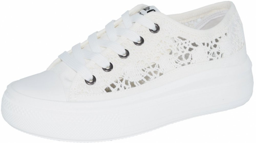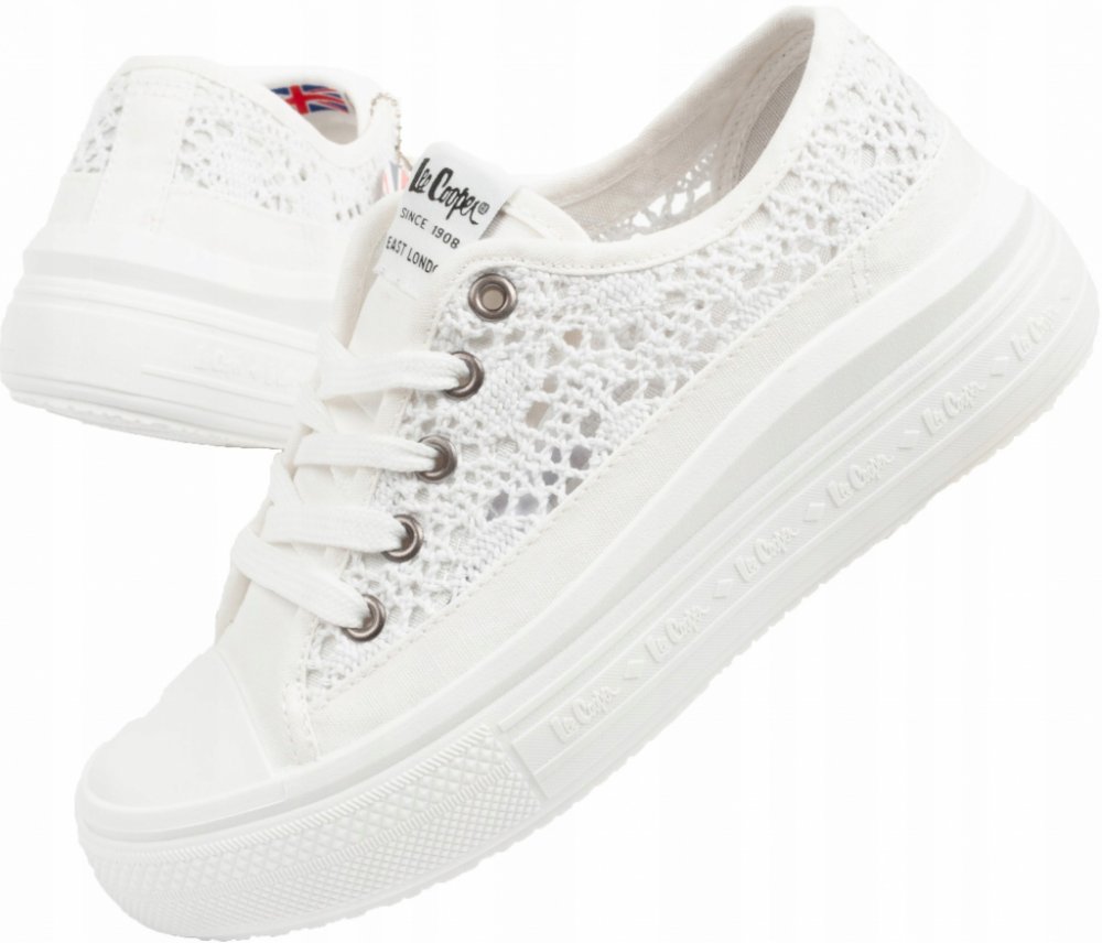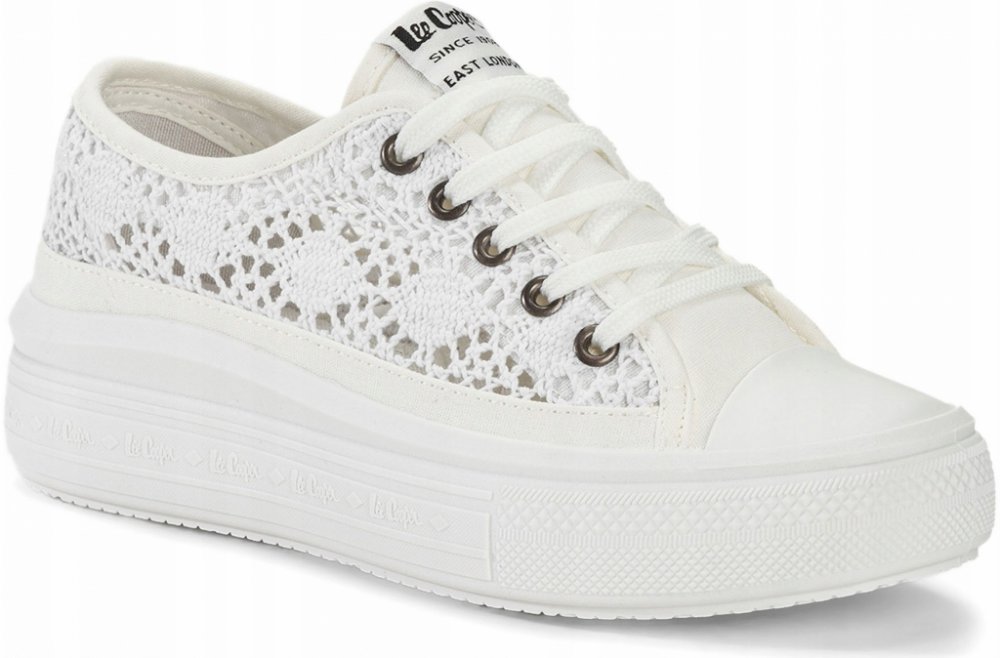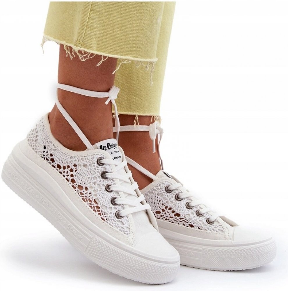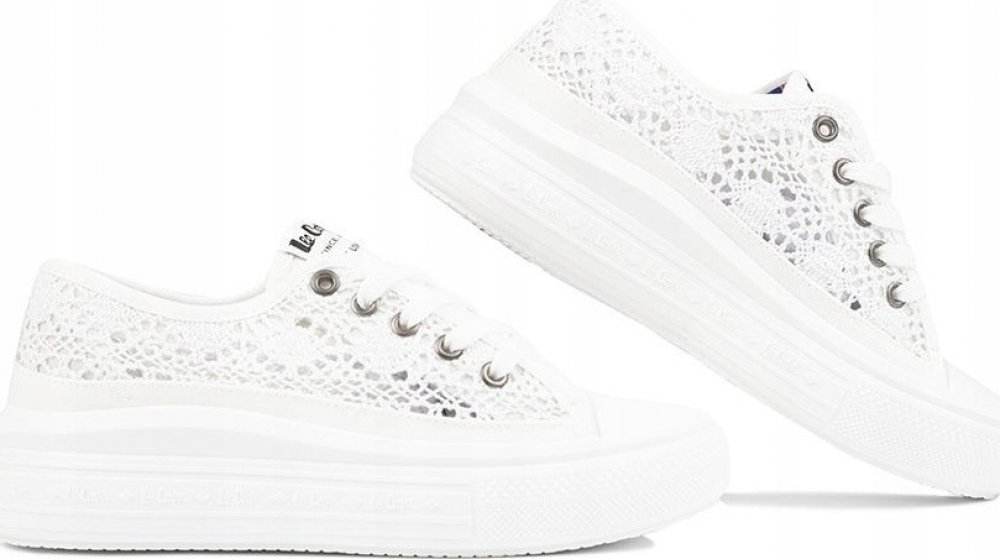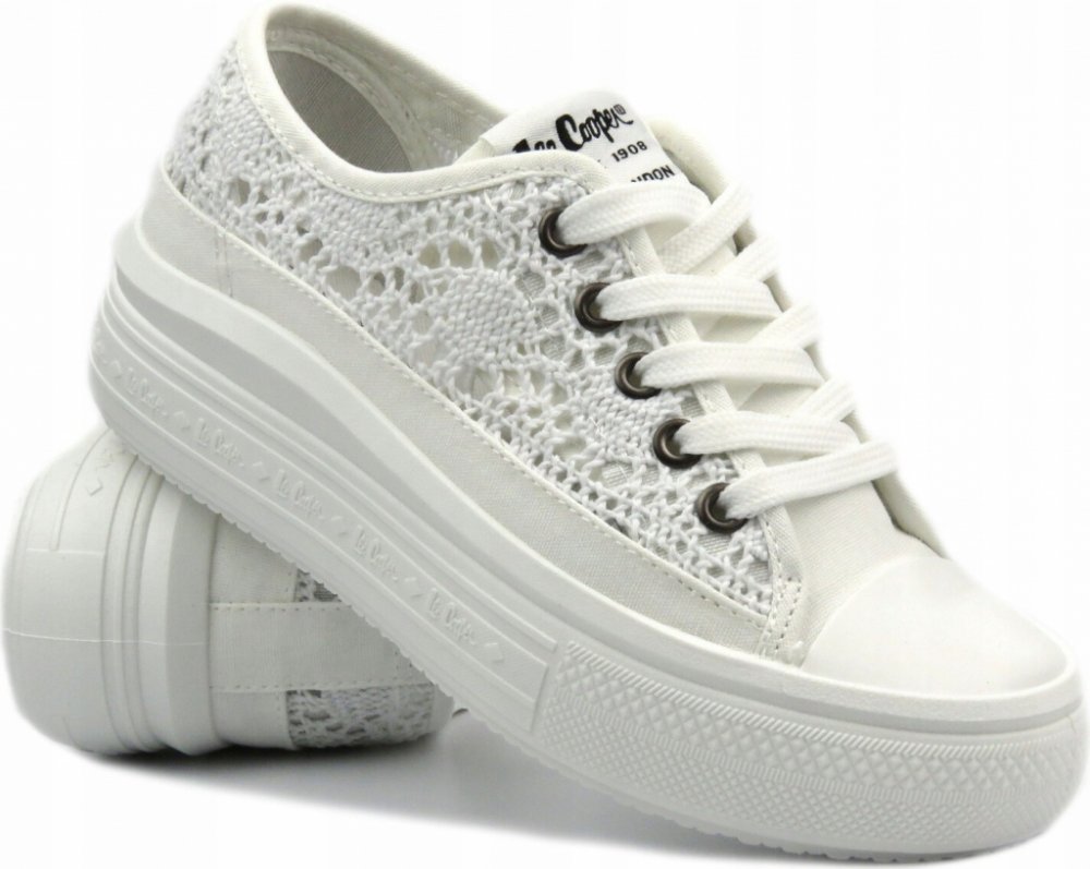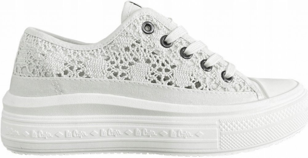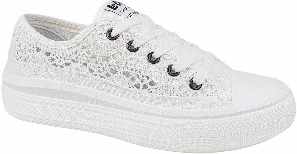Dámské tenisky Lee Cooper. Celo - bílý model. Vzdušný svršek v podobě krajky zjemňuje vyšší podešev a dodává jí tak vzhled lehkosti a impozantnosti. Model je vhodný k nošení od teplého jara do podzimu a skvěle doplní sukně i kalhoty. Skvěle se hodí také jako svatební tenisky.