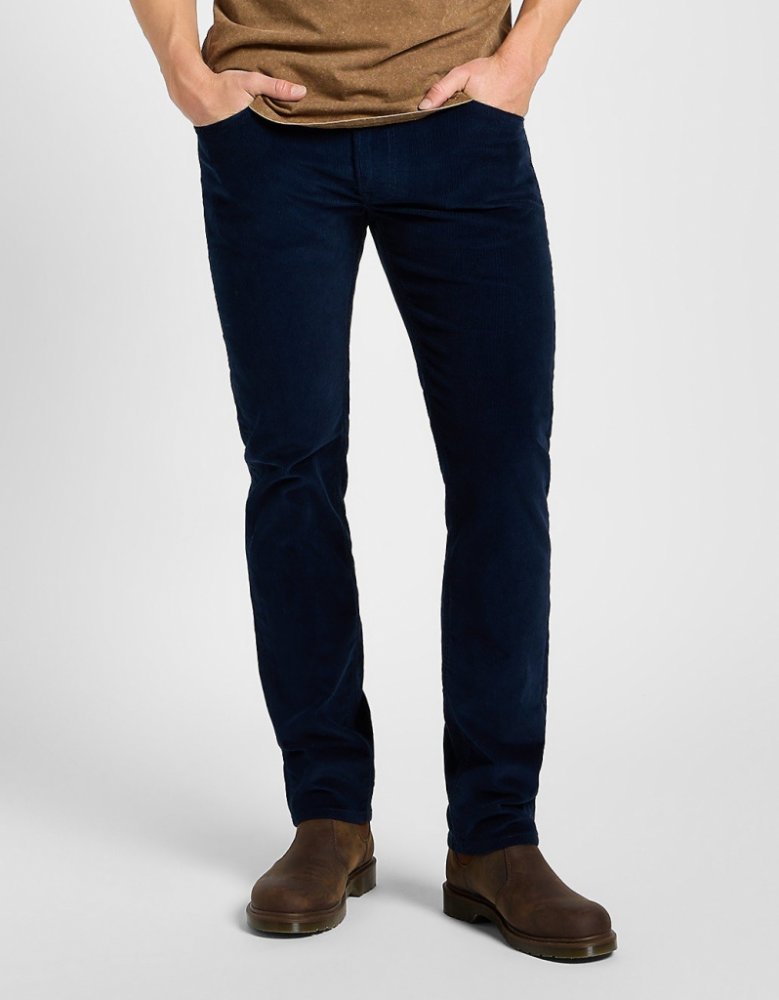Tmavě modré manšestrové kalhoty v rovném střihu Daren, pěti kapsami a se zapínáním na zip. Kalhoty s propracovanými detaily, slabším proužkem. Vyrobeny s příměsí 2 % elastanu pro pohodlné nošení.
